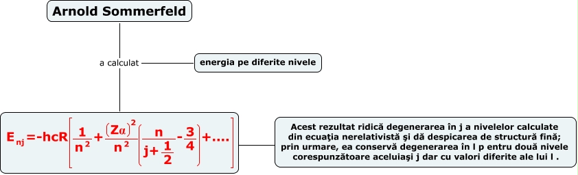 This Concept Map, created with IHMC CmapTools, has information related to: Relativitatea clasica - formula Sommerfeld, Acest rezultat ridică degenerarea în j a nivelelor calculate din ecuaţia nerelativistă şi dă despicarea de structură fină; prin urmare, ea conservă degenerarea în l p entru două nivele corespunzătoare aceluiaşi j dar cu valori diferite ale lui l . ???? ????, Arnold Sommerfeld a calculat <math xmlns="http://www.w3.org/1998/Math/MathML"> <mtext> energia pe diferite nivele </mtext> </math>, Arnold Sommerfeld a calculat <math xmlns="http://www.w3.org/1998/Math/MathML"> <mrow> <mmultiscripts> <mtext> E </mtext> <mtext> nj </mtext> <none/> </mmultiscripts> <mtext> =-hcR </mtext> <mfenced open="[" close="]"> <mfrac> <mtext> 1 </mtext> <mmultiscripts> <mtext> n </mtext> <none/> <mtext> 2 </mtext> </mmultiscripts> </mfrac> <mtext> + </mtext> <mfrac> <mmultiscripts> <mfenced open="(" close=")"> <mtext> Zα </mtext> </mfenced> <none/> <mtext> 2 </mtext> </mmultiscripts> <mmultiscripts> <mtext> n </mtext> <none/> <mtext> 2 </mtext> </mmultiscripts> </mfrac> <mfenced open="(" close=")"> <mfrac> <mtext> n </mtext> <mrow> <mtext> j+ </mtext> <mfrac> <mtext> 1 </mtext> <mtext> 2 </mtext> </mfrac> </mrow> </mfrac> <mtext> - </mtext> <mfrac> <mtext> 3 </mtext> <mtext> 4 </mtext> </mfrac> </mfenced> <mtext> +.... </mtext> </mfenced> </mrow> </math>