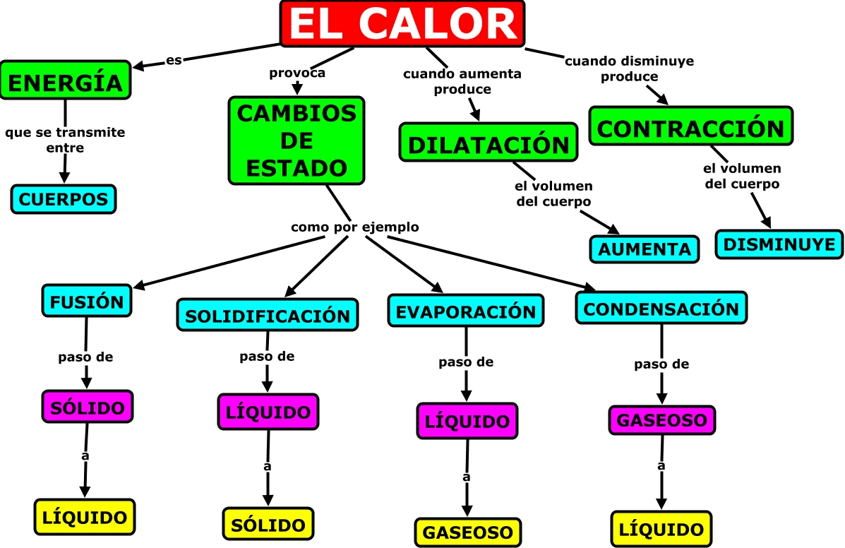 Este Cmap, tiene información relacionada con: el calor, GASEOSO a LÍQUIDO, LÍQUIDO a SÓLIDO, LÍQUIDO a GASEOSO, SÓLIDO a LÍQUIDO, ENERGÍA que se transmite entre CUERPOS, SOLIDIFICACIÓN paso de LÍQUIDO, EL CALOR cuando disminuye produce CONTRACCIÓN, DILATACIÓN el volumen del cuerpo AUMENTA, EVAPORACIÓN paso de LÍQUIDO, EL CALOR es ENERGÍA, CONTRACCIÓN el volumen del cuerpo DISMINUYE, FUSIÓN paso de SÓLIDO, CAMBIOS DE ESTADO como por ejemplo FUSIÓN, EL CALOR provoca CAMBIOS DE ESTADO, CAMBIOS DE ESTADO como por ejemplo EVAPORACIÓN, EL CALOR cuando aumenta produce DILATACIÓN, CONDENSACIÓN paso de GASEOSO, CAMBIOS DE ESTADO como por ejemplo SOLIDIFICACIÓN, CAMBIOS DE ESTADO como por ejemplo CONDENSACIÓN