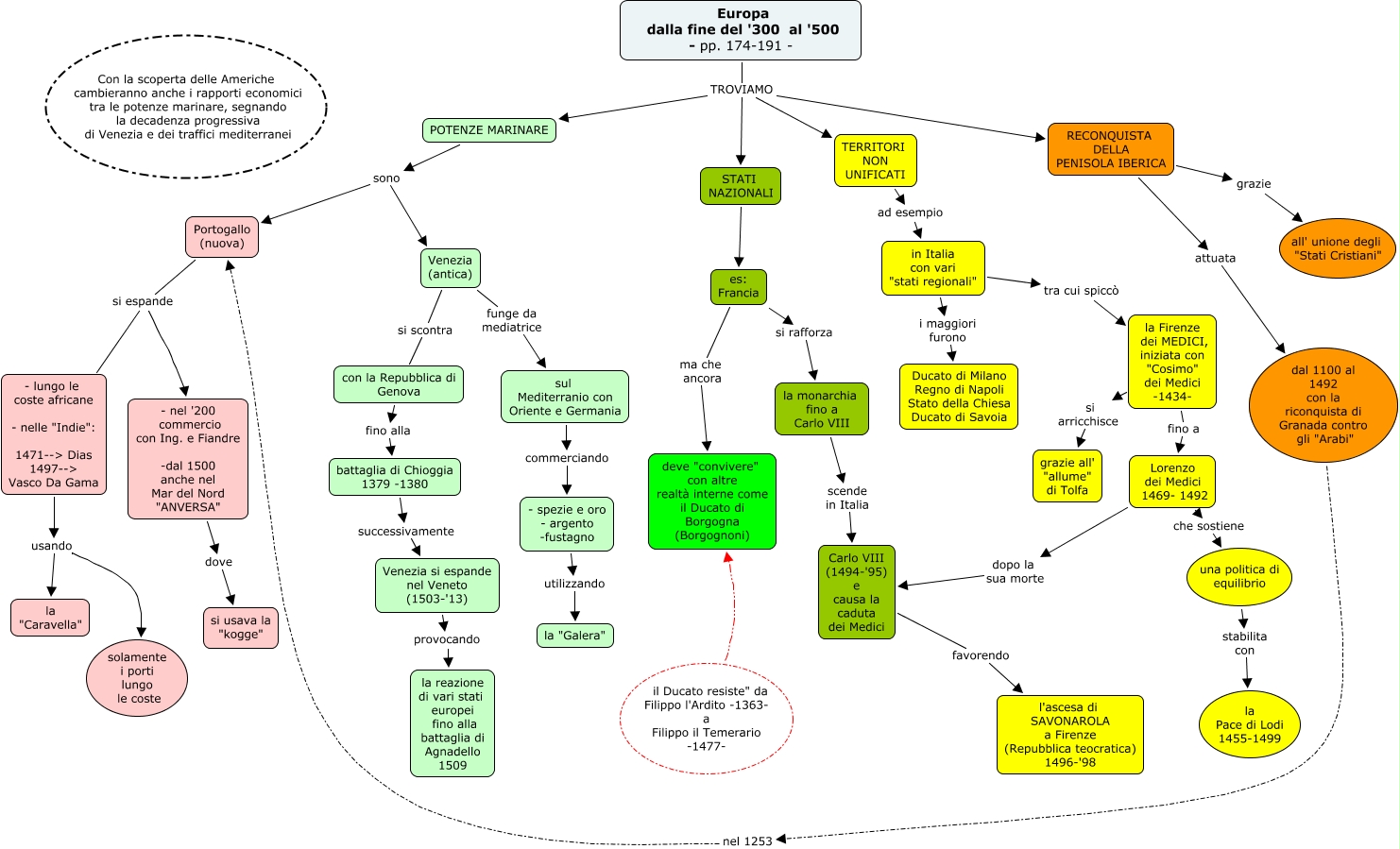 Questa Cmap, creata con IHMC CmapTools, contiene informazioni relative a: Europa tra la fine del 300 inizio 500, RECONQUISTA DELLA PENISOLA IBERICA attuata dal 1100 al 1492 con la riconquista di Granada contro gli "Arabi", in Italia con vari "stati regionali" i maggiori furono Ducato di Milano Regno di Napoli Stato della Chiesa Ducato di Savoia, - spezie e oro - argento -fustagno utilizzando la "Galera", - nel '200 commercio con Ing. e Fiandre -dal 1500 anche nel Mar del Nord "ANVERSA" dove si usava la "kogge", STATI NAZIONALI es: Francia, Europa dalla fine del '300 al '500 - pp. 174-191 - TROVIAMO POTENZE MARINARE, Venezia (antica) si scontra con la Repubblica di Genova, sul Mediterranio con Oriente e Germania commerciando - spezie e oro - argento -fustagno, Venezia (antica) funge da mediatrice sul Mediterranio con Oriente e Germania, Europa dalla fine del '300 al '500 - pp. 174-191 - TROVIAMO RECONQUISTA DELLA PENISOLA IBERICA, TERRITORI NON UNIFICATI ad esempio in Italia con vari "stati regionali", con la Repubblica di Genova fino alla battaglia di Chioggia 1379 -1380, il Ducato resiste" da Filippo l'Ardito -1363- a Filippo il Temerario -1477- deve "convivere" con altre realtà interne come il Ducato di Borgogna (Borgognoni), una politica di equilibrio stabilita con la Pace di Lodi 1455-1499, la monarchia fino a Carlo VIII scende in Italia Carlo VIII (1494-'95) e causa la caduta dei Medici, Carlo VIII (1494-'95) e causa la caduta dei Medici favorendo l'ascesa di SAVONAROLA a Firenze (Repubblica teocratica) 1496-'98, POTENZE MARINARE sono Venezia (antica), Lorenzo dei Medici 1469- 1492 dopo la sua morte Carlo VIII (1494-'95) e causa la caduta dei Medici, Portogallo (nuova) si espande - lungo le coste africane - nelle "Indie": 1471--> Dias 1497--> Vasco Da Gama, in Italia con vari "stati regionali" tra cui spiccò la Firenze dei MEDICI, iniziata con "Cosimo" dei Medici -1434-