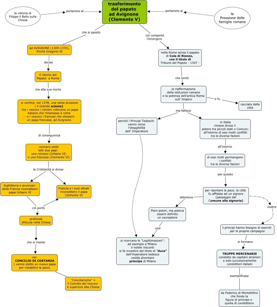 Questa Cmap, creata con IHMC CmapTools, contiene informazioni relative a: Cola di Rienzo, Signorie, Grande Scisma, per riportare la pace, la città fu affidata ad un signore (passaggio dal Comune alla signoria) inoltre I principi hanno bisogno di eserciti per le proprie campagne, Inghilterra e avversari della Francia riconobbero papa Urbano VI ciò portò Francia e i suoi alleati riconobbero il papa Clemente VI, la riaffermazione delle istituzioni romane e la potenza dell'antica Roma sull' Impero e fu cacciato dalla città, trasferimento del papato ad Avignone (Clemente V) ciò comportò l'emergere nella Roma senza il papato di Cola di Rienzo, con il titolo di Tribuno del Popolo - 1347 -, profonda sfiducia nella Chiesa che si risolse nel CONCILIO DI COSTANZA ( venne eletto un nuovo papa per ristabilire la pace), trasferimento del papato ad Avignone (Clemente V) che si spostò ad AVIGNONE (1309-1376), finchè Gregorio XI, in Italia rimane diviso il potere tra piccoli stati e Comuni; all'interno di essi molti conflitti tra le diverse fazioni all'interno di essi molti permangono i conflitti tra le diverse fazioni, si verificò, nel 1378, una netta divisione ( il Grande scisma) - tra i vescovi i romani volevano un papa italiano che rimanesse a roma - e i vescovi i francesi che elessero un papa francese, ad Avignone. di conseguenza vennero eletti letti due papi: uno romano (Urbano VI) e uno francese (Clemente VI), la riaffermazione delle istituzioni romane e la potenza dell'antica Roma sull' Impero ma fallisce perché i Principi Tedeschi vanno verso l'eleggibilità dell' Imperatore, Pieni poteri, ma poteva essere definito un usurpatore così si ricercano le "Legittimazioni": ad esempio a Milano il nobile Visconti si fa investire del titolo di "duca" dall'imperatore tedesco cosìda diventare principe di Milano, ad AVIGNONE (1309-1376), finchè Gregorio XI decise il ritorno del Papato a Roma, vennero eletti letti due papi: uno romano (Urbano VI) e uno francese (Clemente VI) la Cristianità si divise Francia e i suoi alleati riconobbero il papa Clemente VI, per riportare la pace, la città fu affidata ad un signore (passaggio dal Comune alla signoria) deteneva Pieni poteri, ma poteva essere definito un usurpatore, nel CONCILIO DI COSTANZA ( venne eletto un nuovo papa per ristabilire la pace) "Conciliarismo" = il Concilio dei Vescovi è superiore alla Chiesa, la vittoria di Filippo il Bello sulla Chiesa portarono al trasferimento del papato ad Avignone (Clemente V), vennero eletti letti due papi: uno romano (Urbano VI) e uno francese (Clemente VI) la Cristianità si divise Inghilterra e avversari della Francia riconobbero papa Urbano VI, Inghilterra e avversari della Francia riconobbero papa Urbano VI ciò portò profonda sfiducia nella Chiesa, di essi molti permangono i conflitti tra le diverse fazioni per questo per riportare la pace, la città fu affidata ad un signore (passaggio dal Comune alla signoria), TRUPPE MERCENARIE condotte da capitani stranieri e solo successivamente condottieri italiani esemplificata da Federico di Montefeltro che fonde la figura di principe e quella di condottiero, nella Roma senza il papato di Cola di Rienzo, con il titolo di Tribuno del Popolo - 1347 - che tentò la riaffermazione delle istituzioni romane e la potenza dell'antica Roma sull' Impero