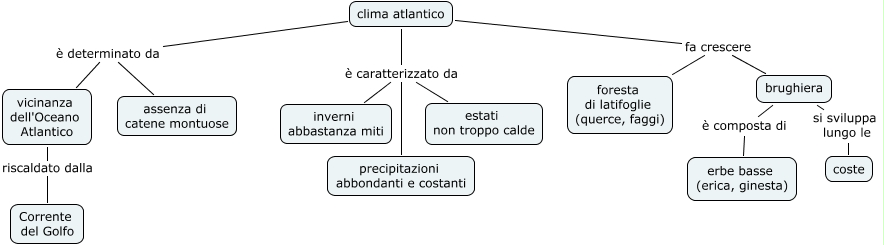 Questa Cmap, creata con IHMC CmapTools, contiene informazioni relative a: V1 C3 g) Il clima atlantico, clima atlantico è determinato da vicinanza dell'Oceano Atlantico, clima atlantico è caratterizzato da inverni abbastanza miti, brughiera è composta di erbe basse (erica, ginesta), vicinanza dell'Oceano Atlantico riscaldato dalla Corrente del Golfo, clima atlantico fa crescere brughiera, brughiera si sviluppa lungo le coste, clima atlantico è caratterizzato da precipitazioni abbondanti e costanti, clima atlantico fa crescere foresta di latifoglie (querce, faggi), clima atlantico è determinato da assenza di catene montuose, clima atlantico è caratterizzato da estati non troppo calde