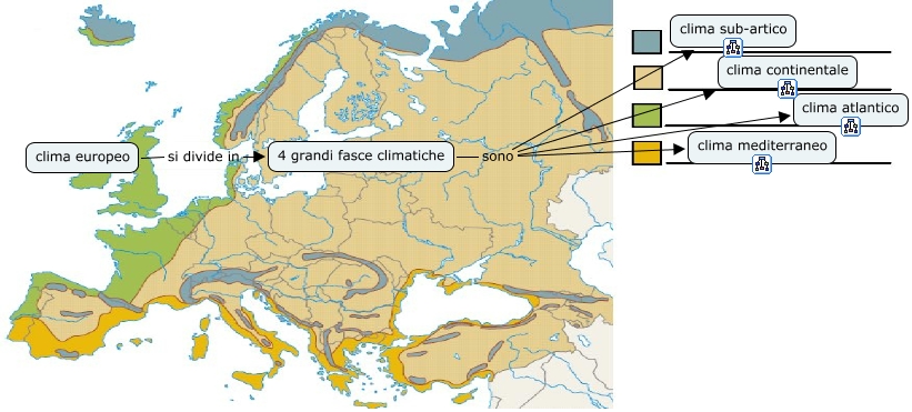 Questa Cmap, creata con IHMC CmapTools, contiene informazioni relative a: V1 C3 f) Il clima in Europa, 4 grandi fasce climatiche sono clima atlantico, 4 grandi fasce climatiche sono clima sub-artico, 4 grandi fasce climatiche sono clima continentale, 4 grandi fasce climatiche sono clima mediterraneo, clima europeo si divide in 4 grandi fasce climatiche