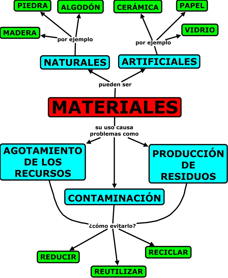 Este Cmap, tiene información relacionada con: materiales, PRODUCCIÓN DE RESIDUOS ¿cómo evitarlo? REUTILIZAR, CONTAMINACIÓN ¿cómo evitarlo? REUTILIZAR, AGOTAMIENTO DE LOS RECURSOS ¿cómo evitarlo? REDUCIR, MATERIALES pueden ser ARTIFICIALES, NATURALES por ejemplo ALGODÓN, MATERIALES su uso causa problemas como PRODUCCIÓN DE RESIDUOS, CONTAMINACIÓN ¿cómo evitarlo? REDUCIR, AGOTAMIENTO DE LOS RECURSOS ¿cómo evitarlo? RECICLAR, PRODUCCIÓN DE RESIDUOS ¿cómo evitarlo? RECICLAR, NATURALES por ejemplo MADERA, PRODUCCIÓN DE RESIDUOS ¿cómo evitarlo? REDUCIR, AGOTAMIENTO DE LOS RECURSOS ¿cómo evitarlo? REUTILIZAR, NATURALES por ejemplo PIEDRA, ARTIFICIALES por ejemplo CERÁMICA, ARTIFICIALES por ejemplo PAPEL, MATERIALES su uso causa problemas como CONTAMINACIÓN, ARTIFICIALES por ejemplo VIDRIO, MATERIALES su uso causa problemas como AGOTAMIENTO DE LOS RECURSOS, CONTAMINACIÓN ¿cómo evitarlo? RECICLAR, MATERIALES pueden ser NATURALES