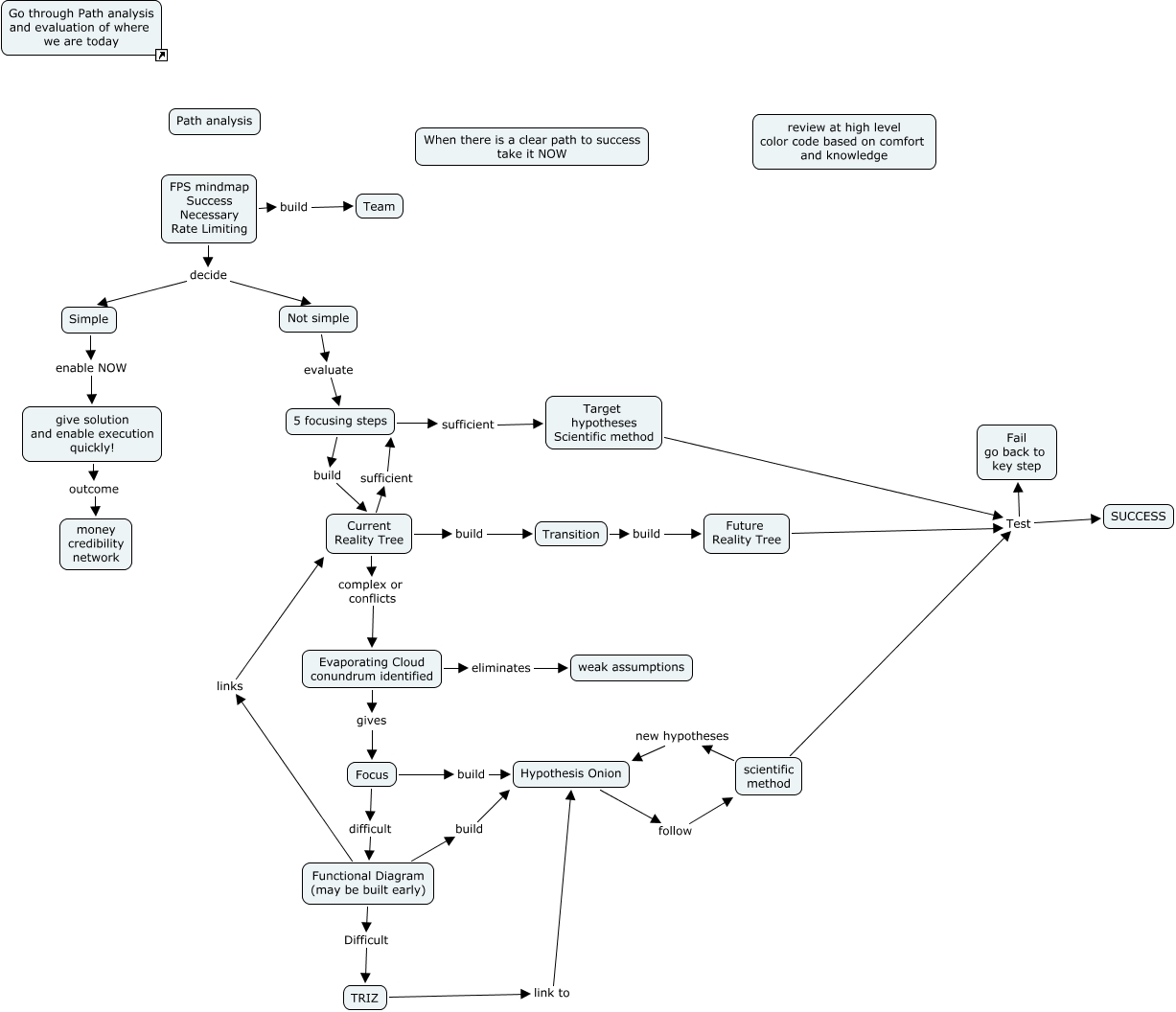 This Concept Map, created with IHMC CmapTools, has information related to: Path Analysis for FPS High level, scientific method new hypotheses Hypothesis Onion, FPS mindmap Success Necessary Rate Limiting decide Not simple, Evaporating Cloud conundrum identified gives Focus, Future Reality Tree Test Fail go back to key step, TRIZ link to Hypothesis Onion, Hypothesis Onion follow scientific method, FPS mindmap Success Necessary Rate Limiting build Team, Target hypotheses Scientific method Test SUCCESS, Simple enable NOW give solution and enable execution quickly!, scientific method Test Fail go back to key step, Focus difficult Functional Diagram (may be built early), Functional Diagram (may be built early) links Current Reality Tree, Functional Diagram (may be built early) Difficult TRIZ, 5 focusing steps sufficient Target hypotheses Scientific method, FPS mindmap Success Necessary Rate Limiting decide Simple, Current Reality Tree build Transition, Transition build Future Reality Tree, Current Reality Tree sufficient 5 focusing steps, Functional Diagram (may be built early) build Hypothesis Onion, Future Reality Tree Test SUCCESS