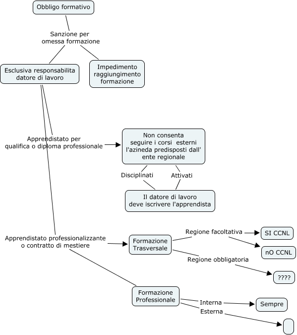 Questa Cmap, creata con IHMC CmapTools, contiene informazioni relative a: Formazione Apprendistato, Esclusiva responsabilita datore di lavoro Apprendistato professionalizzante o contratto di mestiere Formazione Trasversale, Formazione Trasversale Regione obbligatoria ????, Formazione Trasversale Regione facoltativa nO CCNL, Formazione Professionale Esterna, Formazione Professionale Interna Sempre, Non consenta seguire i corsi esterni l'azineda predisposti dall' ente regionale Disciplinati Il datore di lavoro deve iscrivere l'apprendista, Obbligo formativo Sanzione per omessa formazione Esclusiva responsabilita datore di lavoro, Esclusiva responsabilita datore di lavoro Apprendistato per qualifica o diploma professionale Non consenta seguire i corsi esterni l'azineda predisposti dall' ente regionale, Non consenta seguire i corsi esterni l'azineda predisposti dall' ente regionale Attivati Il datore di lavoro deve iscrivere l'apprendista, Obbligo formativo Sanzione per omessa formazione Impedimento raggiungimento formazione, Esclusiva responsabilita datore di lavoro Apprendistato professionalizzante o contratto di mestiere Formazione Professionale, Formazione Trasversale Regione facoltativa SI CCNL