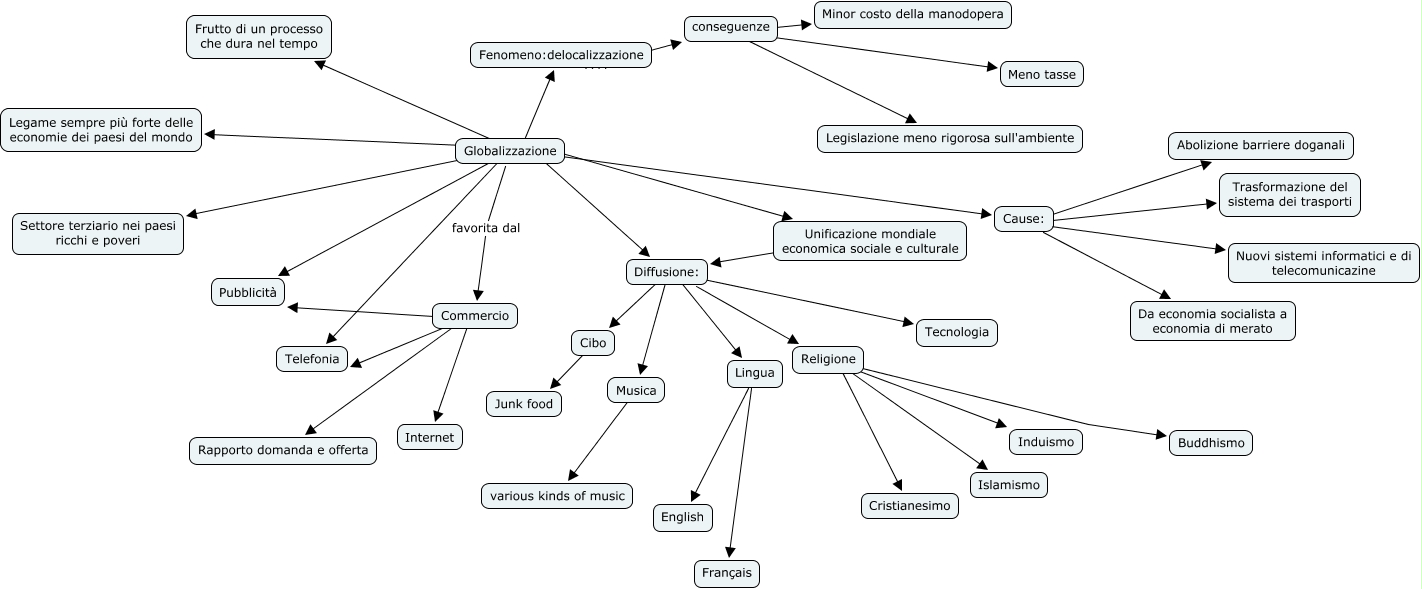 This Concept Map, created with IHMC CmapTools, has information related to: globalizzazione mappa idee Paola, Lingua ???? Français, Unificazione mondiale economica sociale e culturale ???? Diffusione:, Religione ???? Induismo, Globalizzazione ???? Frutto di un processo che dura nel tempo, conseguenze ???? Minor costo della manodopera, Globalizzazione ???? Pubblicità, conseguenze ???? Meno tasse, Globalizzazione ???? Cause:, Globalizzazione ???? Settore terziario nei paesi ricchi e poveri, Diffusione: ???? Tecnologia, Globalizzazione ???? Fenomeno:delocalizzazione, Diffusione: ???? Religione, Religione ???? Buddhismo, Cause: ???? Nuovi sistemi informatici e di telecomunicazine, Globalizzazione ???? Telefonia, Diffusione: ???? Musica, Globalizzazione ???? Unificazione mondiale economica sociale e culturale, Musica ???? various kinds of music, Religione ???? Islamismo, Commercio ???? Internet