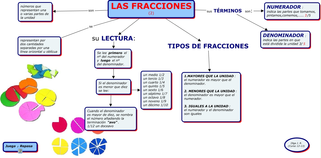 Este Cmap, tiene información relacionada con: LAS FRACCIONES (2), Se lee primero el nº del numerador y luego el nº del denominador. ???? Si el denominador es menor que diez se lee:, LAS FRACCIONES (2) TIPOS DE FRACCIONES 1.MAYORES QUE LA UNIDAD: el numerador es mayor que el denominador. 2. MENORES QUE LA UNIDAD: el denominador es mayor que el numerador. 3. IGUALES A LA UNIDAD: el numerador y el denominador son iguales, LAS FRACCIONES (2) son números que representan una o varias partes de la unidad, Si el denominador es menor que diez se lee: ???? Cuando el denominador es mayor de diez, se nombra el número añadiendo la terminación "avo". 1/12 un doceavo, Si el denominador es menor que diez se lee: ???? un medio 1/2 un tercio 1/3 un cuarto 1/4 un quinto 1/5 un sexto 1/6 un séptimo 1/7 un octavo 1/8 un noveno 1/9 un décimo 1/10, LAS FRACCIONES (2) se representan por dos cantidades separadas por una línea orizontal u oblícua, LAS FRACCIONES (2) sus TÉRMINOS son: DENOMINADOR: indica las partes en que está dividida la unidad 3/5, LAS FRACCIONES (2) su LECTURA: Se lee primero el nº del numerador y luego el nº del denominador., LAS FRACCIONES (2) sus TÉRMINOS son: NUMERADOR: indica las partes que tomamos, pintamos,comemos,.....3/5