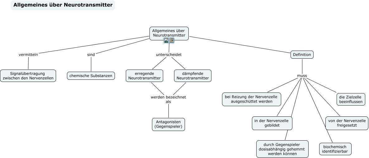 Dieses mit IHMC CmapTools erstellte CMap hat Informationen bezüglich: Allgemeines über Neurotransmitter, Definition muss die Zielzelle beeinflussen, Definition muss bei Reizung der Nervenzelle ausgeschüttet werden, erregende Neurotransmitter werden bezeichnet als Antagonisten (Gegenspieler), Allgemeines über Neurotransmitter sind chemische Substanzen, Allgemeines über Neurotransmitter Definition, Allgemeines über Neurotransmitter unterscheidet dämpfende Neurotransmitter, Definition muss durch Gegenspieler dosisabhängig gehemmt werden können, Definition muss von der Nervenzelle freigesetzt, Definition muss in der Nervenzelle gebildet, Definition muss biochemisch identifizierbar, dämpfende Neurotransmitter werden bezeichnet als Antagonisten (Gegenspieler), Allgemeines über Neurotransmitter vermitteln Signalübertragung zwischen den Nervenzellen, Allgemeines über Neurotransmitter unterscheidet erregende Neurotransmitter