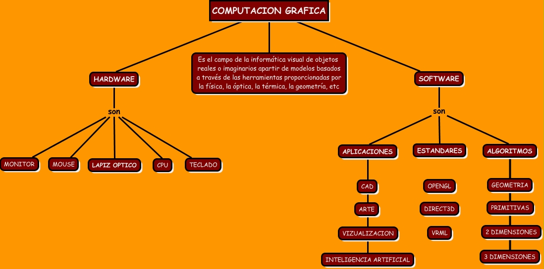 Este Cmap, tiene información relacionada con: COMPUTACION GRAFICA, SOFTWARE son ESTANDARES, APLICACIONES INTELIGENCIA ARTIFICIAL, HARDWARE son MOUSE, HARDWARE son MONITOR, HARDWARE son TECLADO, HARDWARE son CPU, COMPUTACION GRAFICA Es el campo de la informática visual de objetos reales o imaginarios apartir de modelos basados a través de las herramientas proporcionadas por la física, la óptica, la térmica, la geometría, etc, COMPUTACION GRAFICA HARDWARE, HARDWARE son LAPIZ OPTICO, COMPUTACION GRAFICA SOFTWARE, ALGORITMOS 3 DIMENSIONES, SOFTWARE son APLICACIONES, SOFTWARE son ALGORITMOS