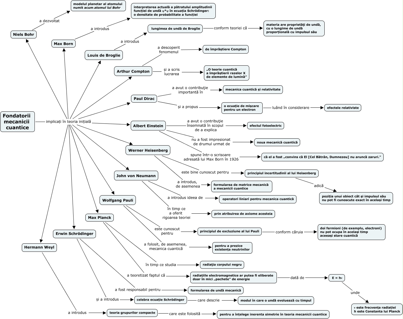 This Concept Map, created with IHMC CmapTools, has information related to: Fondatorii mecanicii cuantice, Fondatorii mecanicii cuantice implicați în teoria inițială John von Neumann, principiul incertitudinii al lui Heisenberg adică poziția unui obiect cât și impulsul său nu pot fi cunoscute exact în același timp, Arthur Compton a descoperit fenomenul de împrăștiere Compton, Fondatorii mecanicii cuantice implicați în teoria inițială Paul Dirac, radiațiile electromagnetice ar putea fi eliberate doar în mici „pachete” de energie dată de E = hν, Fondatorii mecanicii cuantice implicați în teoria inițială Werner Heisenberg, Wolfgang Pauli a folosit, de asemenea, mecanica cuantică pentru a prezice existența neutrinilor, Albert Einstein nu a fost impresionat de drumul urmat de noua mecanică cuantică, Erwin Schrödinger și a introdus celebra ecuație Schrödinger, Hermann Weyl a introdus teoria grupurilor compacte, Paul Dirac a avut o contribuţie importantă în mecanica cuantică și relativitate, John von Neumann în timp ce a oferit rigoarea teoriei prin atribuirea de axiome acesteia, Fondatorii mecanicii cuantice implicați în teoria inițială Hermann Weyl, Albert Einstein spune într-o scrisoare adresată lui Max Born în 1926 că el a fost „convins că El [Cel Bătrân, Dumnezeu] nu aruncă zaruri.", Fondatorii mecanicii cuantice implicați în teoria inițială Arthur Compton, Albert Einstein a avut o contribuţie însemnată în scopul de a explica efectul fotoelectric, Werner Heisenberg a introdus, de asemenea formularea de matrice mecanică a mecanicii cuantice, Paul Dirac și a propus o ecuație de mișcare pentru un electron, Fondatorii mecanicii cuantice implicați în teoria inițială Niels Bohr, Werner Heisenberg este bine cunoscut pentru principiul incertitudinii al lui Heisenberg