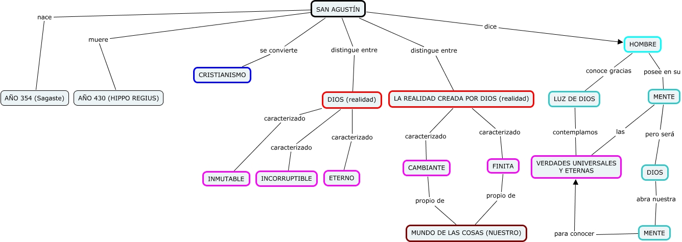 Este Cmap, tiene información relacionada con: SAN AGUSTÍN, DIOS (realidad) caracterizado INCORRUPTIBLE, FINITA propio de MUNDO DE LAS COSAS (NUESTRO), MENTE las VERDADES UNIVERSALES Y ETERNAS, SAN AGUSTÍN se convierte CRISTIANISMO, DIOS abra nuestra MENTE, SAN AGUSTÍN dice HOMBRE, DIOS (realidad) caracterizado ETERNO, LA REALIDAD CREADA POR DIOS (realidad) caracterizado FINITA, MENTE pero será DIOS, LA REALIDAD CREADA POR DIOS (realidad) caracterizado CAMBIANTE, SAN AGUSTÍN nace AÑO 354 (Sagaste), HOMBRE conoce gracias LUZ DE DIOS, CAMBIANTE propio de MUNDO DE LAS COSAS (NUESTRO), SAN AGUSTÍN distingue entre DIOS (realidad), MENTE para conocer VERDADES UNIVERSALES Y ETERNAS, SAN AGUSTÍN muere AÑO 430 (HIPPO REGIUS), LUZ DE DIOS contemplamos VERDADES UNIVERSALES Y ETERNAS, SAN AGUSTÍN distingue entre LA REALIDAD CREADA POR DIOS (realidad), HOMBRE posee en su MENTE, DIOS (realidad) caracterizado INMUTABLE
