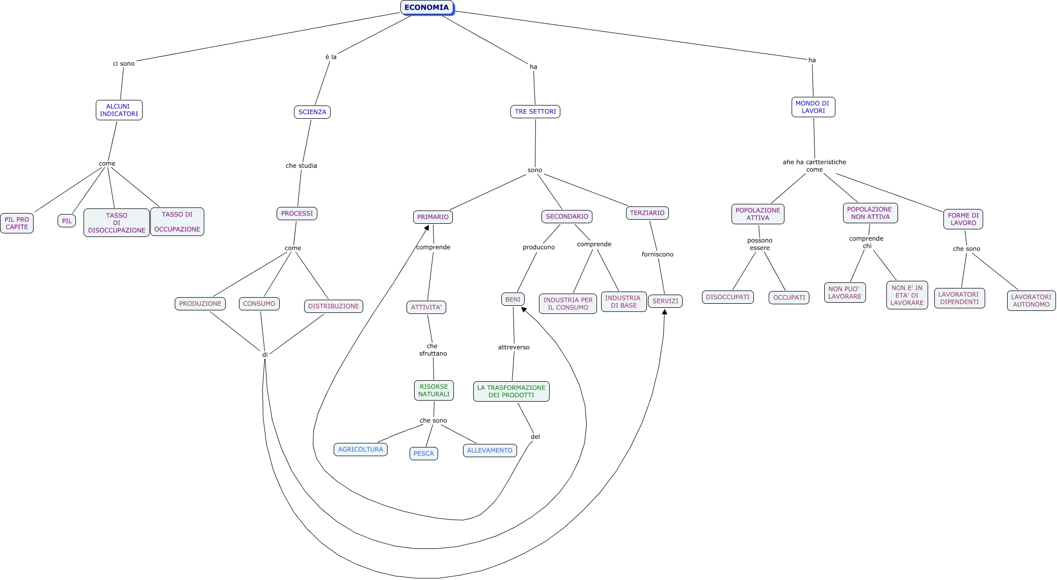 Questa Cmap, creata con IHMC CmapTools, contiene informazioni relative a: Economia, TERZIARIO forniscono SERVIZI, POPOLAZIONE ATTIVA possono essere DISOCCUPATI, ALCUNI INDICATORI come PIL, SECONDARIO comprende INDUSTRIA DI BASE, TRE SETTORI sono PRIMARIO, SECONDARIO comprende INDUSTRIA PER IL CONSUMO, PRODUZIONE di SERVIZI, SECONDARIO producono BENI, ECONOMIA ci sono ALCUNI INDICATORI, PROCESSI come DISTRIBUZIONE, MONDO DI LAVORI ahe ha cartteristiche come POPOLAZIONE ATTIVA, FORME DI LAVORO che sono LAVORATORI DIPENDENTI, SCIENZA che studia PROCESSI, ATTIVITA' che sfruttano RISORSE NATURALI, MONDO DI LAVORI ahe ha cartteristiche come FORME DI LAVORO, ECONOMIA ha TRE SETTORI, ALCUNI INDICATORI come TASSO DI DISOCCUPAZIONE, TRE SETTORI sono TERZIARIO, DISTRIBUZIONE di SERVIZI, LA TRASFORMAZIONE DEI PRODOTTI del PRIMARIO