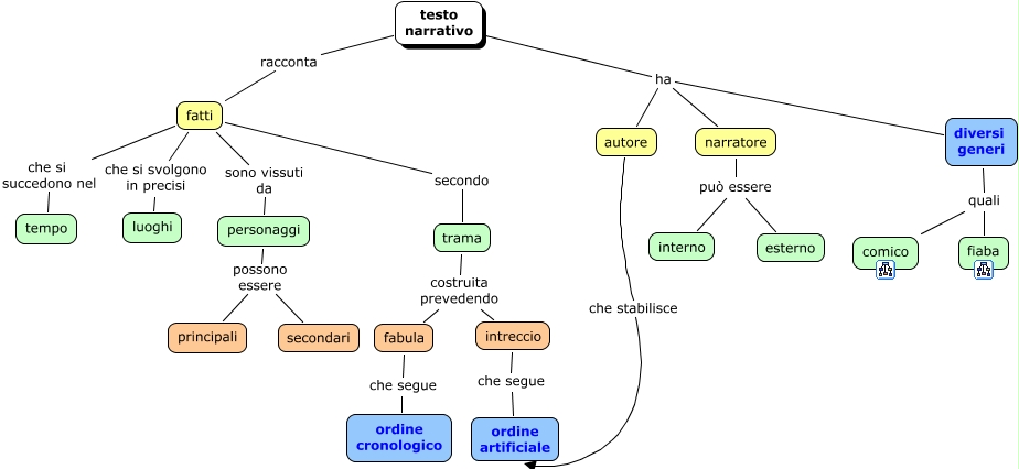 Questa Cmap, creata con IHMC CmapTools, contiene informazioni relative a: testo narrativo, testo narrativo ha autore, testo narrativo racconta fatti, personaggi possono essere principali, personaggi possono essere secondari, narratore può essere esterno, testo narrativo ha narratore, trama costruita prevedendo fabula, trama costruita prevedendo intreccio, fatti secondo trama, narratore può essere interno, fatti sono vissuti da personaggi, testo narrativo ha diversi generi, fatti che si svolgono in precisi luoghi, fabula che segue ordine cronologico, intreccio che segue ordine artificiale, diversi generi quali comico, diversi generi quali fiaba, autore che stabilisce ordine artificiale, fatti che si succedono nel tempo