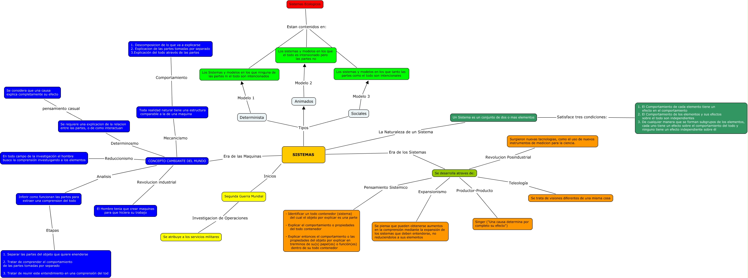 Este Cmap, tiene información relacionada con: Sistemas, Se desarrolla atraves de: Expansionismo Se piensa que pueden obtenerse aumentos en la comprensión mediante la expansión de los sistemas que deben entenderse, no reduciendolos a sus elementos, Se desarrolla atraves de: Productor-Producto Singer ("Una causa determina por completo su efecto"), SISTEMAS Tipos Sociales, Se requiere una explicacion de la relacion entre las partes, o de como interactuan pensamiento casual Se considera que una causa explica completamente su efecto, Los Sistemas y modelos en los que ninguna de las partes ni el todo son intencionados Estan contenidos en: Sistemas Ecologicos, CONCEPTO CAMBIANTE DEL MUNDO Reduccionismo En todo campo de la investigación el hombre busco la comprensión investuigando a los elementos, Toda realidad natural tiene una estructura comparable a la de una maquina Comportamiento 1. Descomposicion de lo que va a explicarse 2. Explicacion de las partes tomadas por separado 3.Explicación del todo através de las partes, Determinista Modelo 1 Los Sistemas y modelos en los que ninguna de las partes ni el todo son intencionados, SISTEMAS Era de los Sistemas Se desarrolla atraves de:, SISTEMAS La Naturaleza de un Sistema Un Sistema es un conjunto de dos o mas elementos, Animados Modelo 2 Los sistemas y modelos en los que el todo es intensionado pero las partes no, Un Sistema es un conjunto de dos o mas elementos Satisface tres condiciones: 1. El Comportamiento de cada elemento tiene un efecto en el comportamiento 2. El Comportamiento de los elementos y sus efectos sobre el todo son independientes 3. De cualquier manera que se forman subgrupos de los elementos, cada uno tiene un efecto sobre el comportamiento del todo y ninguno tiene un efecto independiente sobre él, Segunda Guerra Mundial Investigacion de Operaciones Se atribuye a los servicios militares, SISTEMAS Tipos Determinista, Segunda Guerra Mundial Inicios SISTEMAS, CONCEPTO CAMBIANTE DEL MUNDO Revolucion industrial El Hombre tenia que crear maquinas para que hiciera su trabajo, CONCEPTO CAMBIANTE DEL MUNDO Analisis Inferir como funcionan las partes para extraer una comprension del todo, Se desarrolla atraves de: Revolucion Posindustrial Surgieron nuevas tecnologias, como el uso de nuevos instrumentos de medicion para la ciencia., Los Sistemas y modelos en los que ninguna de las partes ni el todo son intencionados Estan contenidos en: Los sistemas y modelos en los que tanto las partes como el todo son intencionales, Los Sistemas y modelos en los que ninguna de las partes ni el todo son intencionados Estan contenidos en: Los sistemas y modelos en los que el todo es intensionado pero las partes no