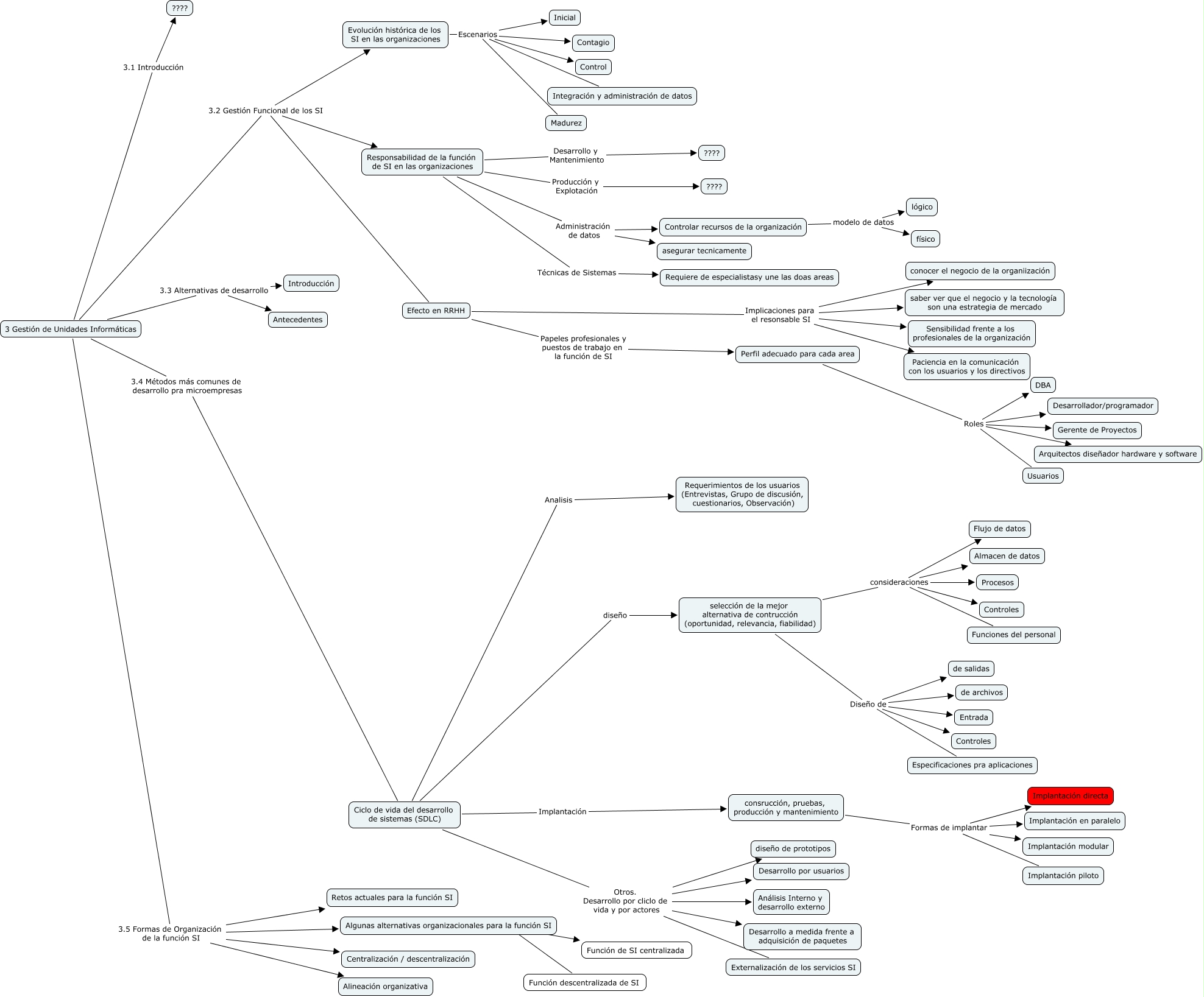 Este Cmap, tiene información relacionada con: 2 3 GESTION DE UNIDADES INFORMATICAS, selección de la mejor alternativa de contrucción (oportunidad, relevancia, fiabilidad) consideraciones Controles, Efecto en RRHH Implicaciones para el resonsable SI Sensibilidad frente a los profesionales de la organización, Perfil adecuado para cada area Roles Usuarios, Responsabilidad de la función de SI en las organizaciones Producción y Explotación ????, consrucción, pruebas, producción y mantenimiento Formas de implantar Implantación en paralelo, selección de la mejor alternativa de contrucción (oportunidad, relevancia, fiabilidad) Diseño de de salidas, Algunas alternativas organizacionales para la función SI ???? Función de SI centralizada, Evolución histórica de los SI en las organizaciones Escenarios Contagio, 3 Gestión de Unidades Informáticas 3.2 Gestión Funcional de los SI Responsabilidad de la función de SI en las organizaciones, Ciclo de vida del desarrollo de sistemas (SDLC) diseño selección de la mejor alternativa de contrucción (oportunidad, relevancia, fiabilidad), Controlar recursos de la organización modelo de datos físico, Efecto en RRHH Implicaciones para el resonsable SI saber ver que el negocio y la tecnología son una estrategia de mercado, Perfil adecuado para cada area Roles DBA, Ciclo de vida del desarrollo de sistemas (SDLC) Analisis Requerimientos de los usuarios (Entrevistas, Grupo de discusión, cuestionarios, Observación), Evolución histórica de los SI en las organizaciones Escenarios Madurez, Ciclo de vida del desarrollo de sistemas (SDLC) Otros. Desarrollo por cliclo de vida y por actores Desarrollo a medida frente a adquisición de paquetes, selección de la mejor alternativa de contrucción (oportunidad, relevancia, fiabilidad) Diseño de de archivos, consrucción, pruebas, producción y mantenimiento Formas de implantar Implantación piloto, Ciclo de vida del desarrollo de sistemas (SDLC) Otros. Desarrollo por cliclo de vida y por actores Desarrollo por usuarios, 3 Gestión de Unidades Informáticas 3.5 Formas de Organización de la función SI Algunas alternativas organizacionales para la función SI