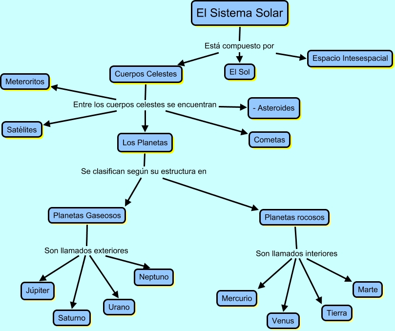 Este Cmap, tiene información relacionada con: Clases de planetas, Planetas rocosos Son llamados interiores Mercurio, Planetas Gaseosos Son llamados exteriores Neptuno, Los Planetas Se clasifican según su estructura en Planetas rocosos, Cuerpos Celestes Entre los cuerpos celestes se encuentran Cometas, Planetas rocosos Son llamados interiores Tierra, El Sistema Solar Está compuesto por Espacio Intesespacial, Planetas Gaseosos Son llamados exteriores Urano, El Sistema Solar Está compuesto por El Sol, El Sistema Solar Está compuesto por Cuerpos Celestes, Planetas Gaseosos Son llamados exteriores Saturno, Planetas rocosos Son llamados interiores Marte, Los Planetas Se clasifican según su estructura en Planetas Gaseosos, Cuerpos Celestes Entre los cuerpos celestes se encuentran - Asteroides, Planetas Gaseosos Son llamados exteriores Júpiter, Planetas rocosos Son llamados interiores Venus, Cuerpos Celestes Entre los cuerpos celestes se encuentran Meteroritos, Cuerpos Celestes Entre los cuerpos celestes se encuentran Los Planetas, Cuerpos Celestes Entre los cuerpos celestes se encuentran Satélites