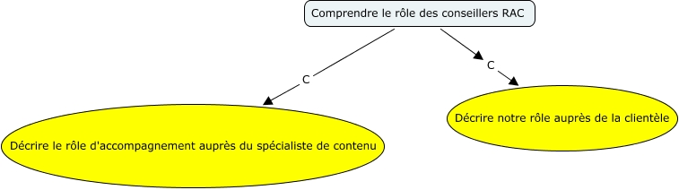 Cette carte de concepts créée avec IHMC CmapTools traite de: Rolecprac, Comprendre le rôle des conseillers RAC C Décrire le rôle d'accompagnement auprès du spécialiste de contenu, Comprendre le rôle des conseillers RAC C Décrire notre rôle auprès de la clientèle