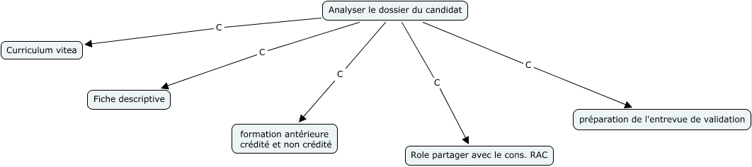 Cette carte de concepts créée avec IHMC CmapTools traite de: analyse, Analyser le dossier du candidat C Fiche descriptive, Analyser le dossier du candidat C préparation de l'entrevue de validation, Analyser le dossier du candidat C Role partager avec le cons. RAC, Analyser le dossier du candidat C formation antérieure crédité et non crédité, Analyser le dossier du candidat C Curriculum vitea