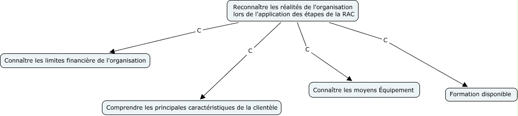 Cette carte de concepts créée avec IHMC CmapTools traite de: realité, Reconnaître les réalités de l'organisation lors de l'application des étapes de la RAC C Connaître les moyens Équipement, Reconnaître les réalités de l'organisation lors de l'application des étapes de la RAC C Formation disponible, Reconnaître les réalités de l'organisation lors de l'application des étapes de la RAC C Connaître les limites financière de l'organisation, Reconnaître les réalités de l'organisation lors de l'application des étapes de la RAC C Comprendre les principales caractéristiques de la clientèle