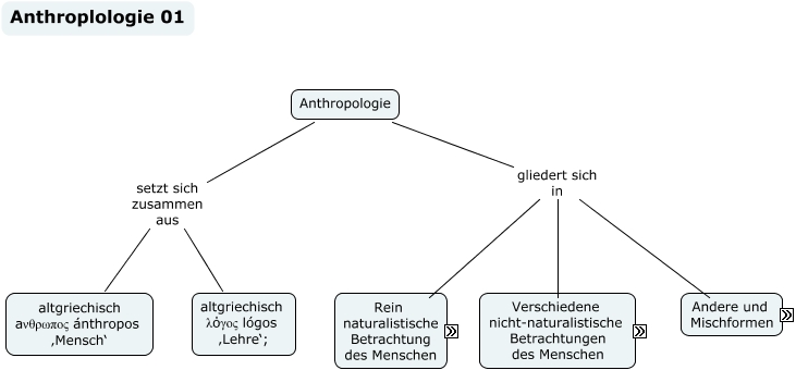 Dieses mit IHMC CmapTools erstellte CMap hat Informationen bezüglich: Anthroplologie 01, Anthropologie gliedert sich in Rein naturalistische Betrachtung des Menschen, Anthropologie setzt sich zusammen aus altgriechisch aνθρωπος ánthropos ‚Mensch‘, Anthropologie gliedert sich in Verschiedene nicht-naturalistische Betrachtungen des Menschen, Anthropologie gliedert sich in Andere und Mischformen, Rein naturalistische Betrachtung des Menschen Naturwissenschaftliche Anthropologie auch physische Anthropologie), Anthropologie setzt sich zusammen aus altgriechisch λόγος lógos ‚Lehre‘;
