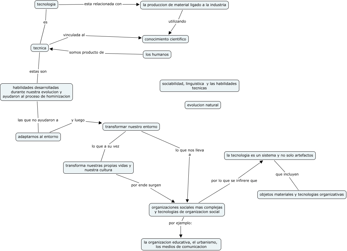 Este Cmap, tiene información relacionada con: tecnologia, tecnologia es tecnica, los humanos somos producto de tecnica, tecnologia esta relacionada con la produccion de material ligado a la industria, transforma nuestras propias vidas y nuestra cultura por ende surgen organizaciones sociales mas complejas y tecnologias de organizacion social, habilidades desarrolladas durante nuestra evolucion y ayudaron al proceso de hominizacion las que no ayudaron a adaptarnos al entorno, tecnica estas son habilidades desarrolladas durante nuestra evolucion y ayudaron al proceso de hominizacion, transformar nuestro entorno lo que nos lleva a organizaciones sociales mas complejas y tecnologias de organizacion social, la produccion de material ligado a la industria utilizando conocimiento cientifico, organizaciones sociales mas complejas y tecnologias de organizacion social por ejemplo: la organizacion educativa, el urbanismo, los medios de comunicacion, transformar nuestro entorno lo que a su vez transforma nuestras propias vidas y nuestra cultura, la tecnologia es un sistema y no solo artefactos que incluyen objetos materiales y tecnologias organizativas, organizaciones sociales mas complejas y tecnologias de organizacion social por lo que se infirere que la tecnologia es un sistema y no solo artefactos, adaptarnos al entorno y luego transformar nuestro entorno, tecnica vinculada al conocimiento cientifico