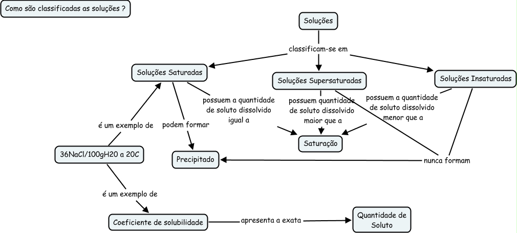 Esse mapa conceitual, produzido no IHMC CmapTools, tem a informação relacionada a: Saturação 2D 2013, Soluções Saturadas possuem a quantidade de soluto dissolvido igual a Saturação, Soluções Insaturadas possuem a quantidade de soluto dissolvido menor que a Saturação, Soluções Supersaturadas possuem quantidade de soluto dissolvido maior que a Saturação, 36NaCl/100gH20 a 20C é um exemplo de Coeficiente de solubilidade, Soluções Insaturadas nunca formam Precipitado, Soluções Saturadas podem formar Precipitado, Soluções classificam-se em Soluções Insaturadas, Soluções classificam-se em Soluções Saturadas, Soluções classificam-se em Soluções Supersaturadas, Coeficiente de solubilidade apresenta a exata Quantidade de Soluto, 36NaCl/100gH20 a 20C é um exemplo de Soluções Saturadas, Soluções Supersaturadas nunca formam Precipitado