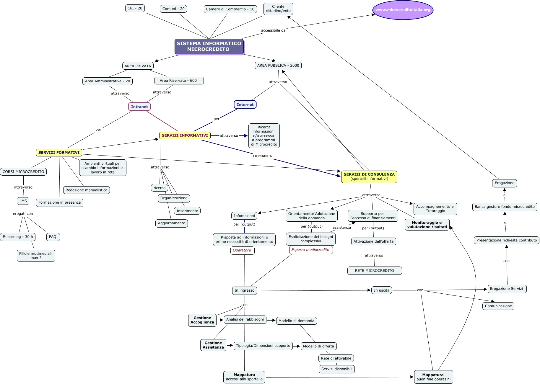 Questa Cmap, creata con IHMC CmapTools, contiene informazioni relative a: Microcredito_Miriam4, Rete di attivabile Servizi disponibili, In uscita con Erogazione Servizi, Infomazioni per (output) Risposta ad informazioni o prime necessità di orientamento, Presentazione richiesta contributo a Banca gestore fondo microcredito, SISTEMA INFORMATICO MICROCREDITO AREA PUBBLICA - 2000, AREA PRIVATA Area Amministrativa - 20, SERVIZI DI CONSULENZA (sportelli informativi) AREA PUBBLICA - 2000, AREA PRIVATA Area Riservata - 600, SERVIZI FORMATIVI CORSI MICROCREDITO, In uscita con Comunicazione, Tipologia/Dimensioni supporto Modello di offerta, Esplicitazione dei bisogni complessivi In ingresso, In ingresso con Gestione Accoglienza, Attivazione dell'offerta attraverso RETE MICROCREDITO, Modello di offerta Rete di attivabile, In uscita con Mappatura buon fine operazini, Cliente cittadino/ente SISTEMA INFORMATICO MICROCREDITO, SERVIZI INFORMATIVI attraverso Ricerca informazioni e/o accesso a programmi di Microcredito, Supporto per l'accesso ai finanziamenti per (output) Attivazione dell'offerta, Orientamento/Valutazione della domanda per (output) Esplicitazione dei bisogni complessivi