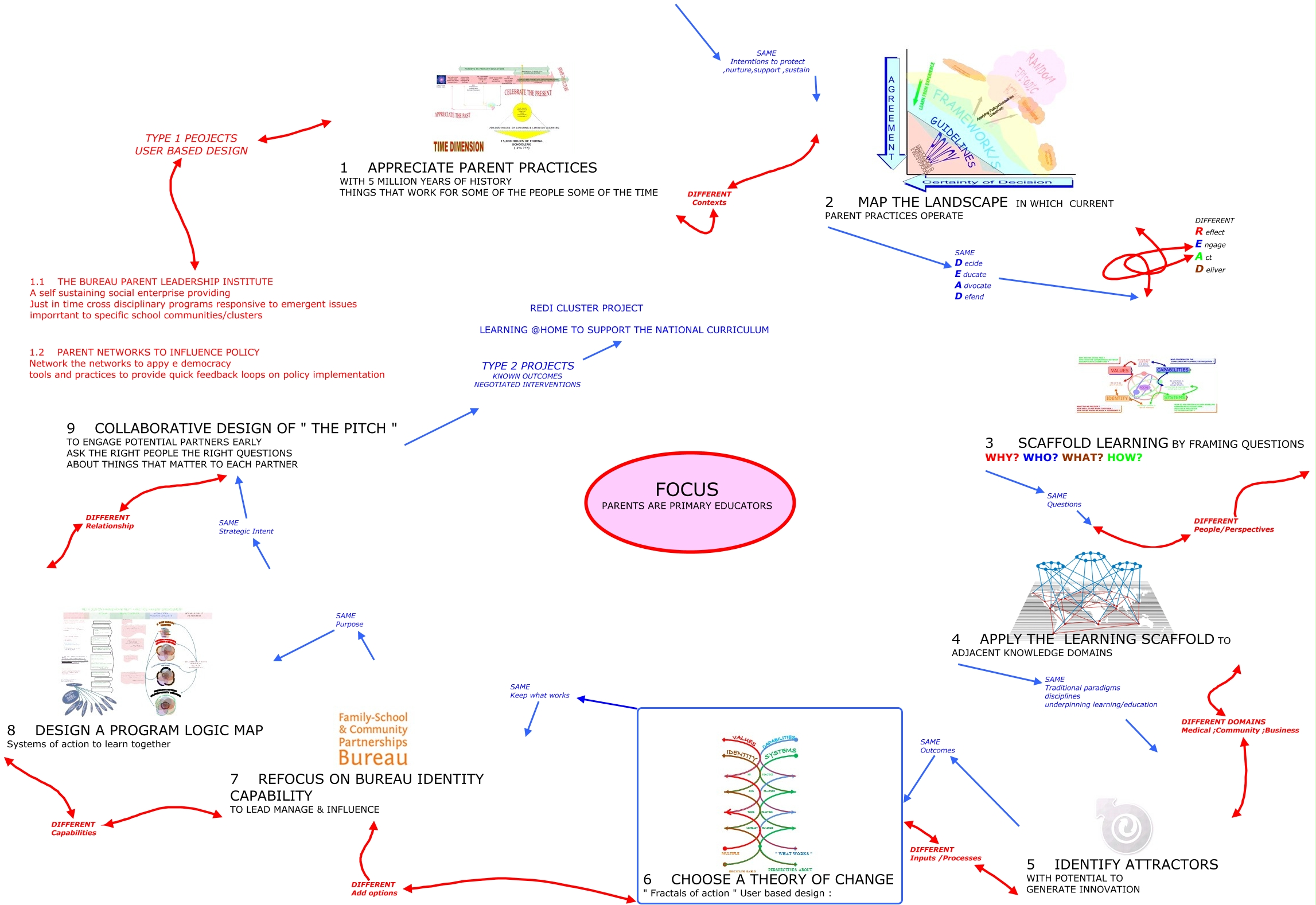 This Concept Map, created with IHMC CmapTools, has information related to: NEXT PRACTICE META DESIGN, 4 APPLY THE LEARNING SCAFFOLD TO ADJACENT KNOWLEDGE DOMAINS DIFFERENT People/Perspectives 3 SCAFFOLD LEARNING BY FRAMING QUESTIONS WHY? WHO? WHAT? HOW?, 5 IDENTIFY ATTRACTORS WITH POTENTIAL TO GENERATE INNOVATION DIFFERENT DOMAINS Medical ;Community ;Business 4 APPLY THE LEARNING SCAFFOLD TO ADJACENT KNOWLEDGE DOMAINS, 6 CHOOSE A THEORY OF CHANGE " Fractals of action " User based design : SAME Keep what works 7 REFOCUS ON BUREAU IDENTITY CAPABILITY TO LEAD MANAGE & INFLUENCE, 5 IDENTIFY ATTRACTORS WITH POTENTIAL TO GENERATE INNOVATION DIFFERENT Inputs /Processes 6 CHOOSE A THEORY OF CHANGE " Fractals of action " User based design :, 2 MAP THE LANDSCAPE IN WHICH CURRENT PARENT PRACTICES OPERATE DIFFERENT Contexts 1 APPRECIATE PARENT PRACTICES WITH 5 MILLION YEARS OF HISTORY THINGS THAT WORK FOR SOME OF THE PEOPLE SOME OF THE TIME, 6 CHOOSE A THEORY OF CHANGE " Fractals of action " User based design : DIFFERENT Add options 7 REFOCUS ON BUREAU IDENTITY CAPABILITY TO LEAD MANAGE & INFLUENCE, 4 APPLY THE LEARNING SCAFFOLD TO ADJACENT KNOWLEDGE DOMAINS SAME Traditional paradigms disciplines underpinning learning/education 5 IDENTIFY ATTRACTORS WITH POTENTIAL TO GENERATE INNOVATION, 1 APPRECIATE PARENT PRACTICES WITH 5 MILLION YEARS OF HISTORY THINGS THAT WORK FOR SOME OF THE PEOPLE SOME OF THE TIME TYPE 1 PEOJECTS USER BASED DESIGN 1.1 THE BUREAU PARENT LEADERSHIP INSTITUTE A self sustaining social enterprise providing Just in time cross disciplinary programs responsive to emergent issues imporrtant to specific school communities/clusters, 5 IDENTIFY ATTRACTORS WITH POTENTIAL TO GENERATE INNOVATION SAME Outcomes 6 CHOOSE A THEORY OF CHANGE " Fractals of action " User based design :, 3 SCAFFOLD LEARNING BY FRAMING QUESTIONS WHY? WHO? WHAT? HOW? SAME Questions 4 APPLY THE LEARNING SCAFFOLD TO ADJACENT KNOWLEDGE DOMAINS, 2 MAP THE LANDSCAPE IN WHICH CURRENT PARENT PRACTICES OPERATE SAME Decide Educate Advocate Defend 3 SCAFFOLD LEARNING BY FRAMING QUESTIONS WHY? WHO? WHAT? HOW?, 8 DESIGN A PROGRAM LOGIC MAP Systems of action to learn together SAME Strategic Intent 9 COLLABORATIVE DESIGN OF " THE PITCH " TO ENGAGE POTENTIAL PARTNERS EARLY ASK THE RIGHT PEOPLE THE RIGHT QUESTIONS ABOUT THINGS THAT MATTER TO EACH PARTNER, 7 REFOCUS ON BUREAU IDENTITY CAPABILITY TO LEAD MANAGE & INFLUENCE SAME Purpose 8 DESIGN A PROGRAM LOGIC MAP Systems of action to learn together, 3 SCAFFOLD LEARNING BY FRAMING QUESTIONS WHY? WHO? WHAT? HOW? DIFFERENT Reflect Engage Act Deliver 2 MAP THE LANDSCAPE IN WHICH CURRENT PARENT PRACTICES OPERATE, 9 COLLABORATIVE DESIGN OF " THE PITCH " TO ENGAGE POTENTIAL PARTNERS EARLY ASK THE RIGHT PEOPLE THE RIGHT QUESTIONS ABOUT THINGS THAT MATTER TO EACH PARTNER TYPE 2 PROJECTS KNOWN OUTCOMES NEGOTIATED INTERVENTIONS LEARNING @HOME TO SUPPORT THE NATIONAL CURRICULUM, 8 DESIGN A PROGRAM LOGIC MAP Systems of action to learn together DIFFERENT Relationship 9 COLLABORATIVE DESIGN OF " THE PITCH " TO ENGAGE POTENTIAL PARTNERS EARLY ASK THE RIGHT PEOPLE THE RIGHT QUESTIONS ABOUT THINGS THAT MATTER TO EACH PARTNER, 7 REFOCUS ON BUREAU IDENTITY CAPABILITY TO LEAD MANAGE & INFLUENCE DIFFERENT Capabilities 8 DESIGN A PROGRAM LOGIC MAP Systems of action to learn together, 1 APPRECIATE PARENT PRACTICES WITH 5 MILLION YEARS OF HISTORY THINGS THAT WORK FOR SOME OF THE PEOPLE SOME OF THE TIME SAME Interntions to protect ,nurture,support ,sustain 2 MAP THE LANDSCAPE IN WHICH CURRENT PARENT PRACTICES OPERATE