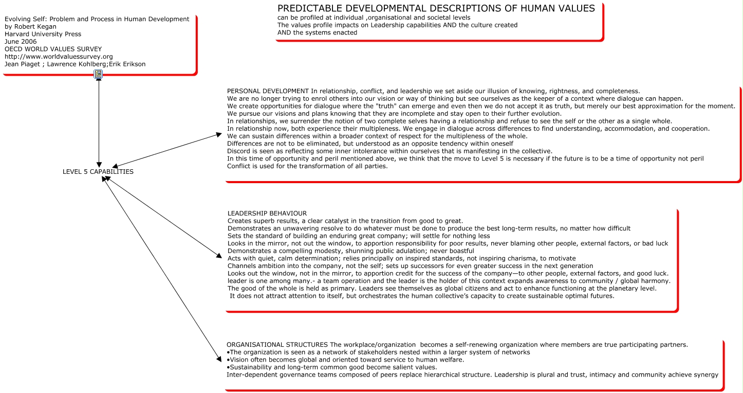 This Concept Map, created with IHMC CmapTools, has information related to: KEGAN ,ROBERT, Evolving Self: Problem and Process in Human Development by Robert Kegan Harvard University Press June 2006 OECD WORLD VALUES SURVEY http://www.worldvaluessurvey.org Jean Piaget ; Lawrence Kohlberg;Erik Erikson LEVEL 5 CAPABILITIES PERSONAL DEVELOPMENT In relationship, conflict, and leadership we set aside our illusion of knowing, rightness, and completeness. We are no longer trying to enrol others into our vision or way of thinking but see ourselves as the keeper of a context where dialogue can happen. We create opportunities for dialogue where the "truth" can emerge and even then we do not accept it as truth, but merely our best approximation for the moment. We pursue our visions and plans knowing that they are incomplete and stay open to their further evolution. In relationships, we surrender the notion of two complete selves having a relationship and refuse to see the self or the other as a single whole. In relationship now, both experience their multipleness. We engage in dialogue across differences to find understanding, accommodation, and cooperation. We can sustain differences within a broader context of respect for the multipleness of the whole. Differences are not to be eliminated, but understood as an opposite tendency within oneself Discord is seen as reflecting some inner intolerance within ourselves that is manifesting in the collective. In this time of opportunity and peril mentioned above, we think that the move to Level 5 is necessary if the future is to be a time of opportunity not peril Conflict is used for the transformation of all parties., Evolving Self: Problem and Process in Human Development by Robert Kegan Harvard University Press June 2006 OECD WORLD VALUES SURVEY http://www.worldvaluessurvey.org Jean Piaget ; Lawrence Kohlberg;Erik Erikson LEVEL 5 CAPABILITIES LEADERSHIP BEHAVIOUR Creates superb results, a clear catalyst in the transition from good to great. Demonstrates an unwavering resolve to do whatever must be done to produce the best long-term results, no matter how difficult Sets the standard of building an enduring great company; will settle for nothing less Looks in the mirror, not out the window, to apportion responsibility for poor results, never blaming other people, external factors, or bad luck Demonstrates a compelling modesty, shunning public adulation; never boastful Acts with quiet, calm determination; relies principally on inspired standards, not inspiring charisma, to motivate Channels ambition into the company, not the self; sets up successors for even greater success in the next generation Looks out the window, not in the mirror, to apportion credit for the success of the company—to other people, external factors, and good luck. leader is one among many.- a team operation and the leader is the holder of this context expands awareness to community / global harmony. The good of the whole is held as primary. Leaders see themselves as global citizens and act to enhance functioning at the planetary level. It does not attract attention to itself, but orchestrates the human collective’s capacity to create sustainable optimal futures., Evolving Self: Problem and Process in Human Development by Robert Kegan Harvard University Press June 2006 OECD WORLD VALUES SURVEY http://www.worldvaluessurvey.org Jean Piaget ; Lawrence Kohlberg;Erik Erikson LEVEL 5 CAPABILITIES ORGANISATIONAL STRUCTURES The workplace/organization becomes a self-renewing organization where members are true participating partners. • The organization is seen as a network of stakeholders nested within a larger system of networks • Vision often becomes global and oriented toward service to human welfare. • Sustainability and long-term common good become salient values. Inter-dependent governance teams composed of peers replace hierarchical structure. Leadership is plural and trust, intimacy and community achieve synergy