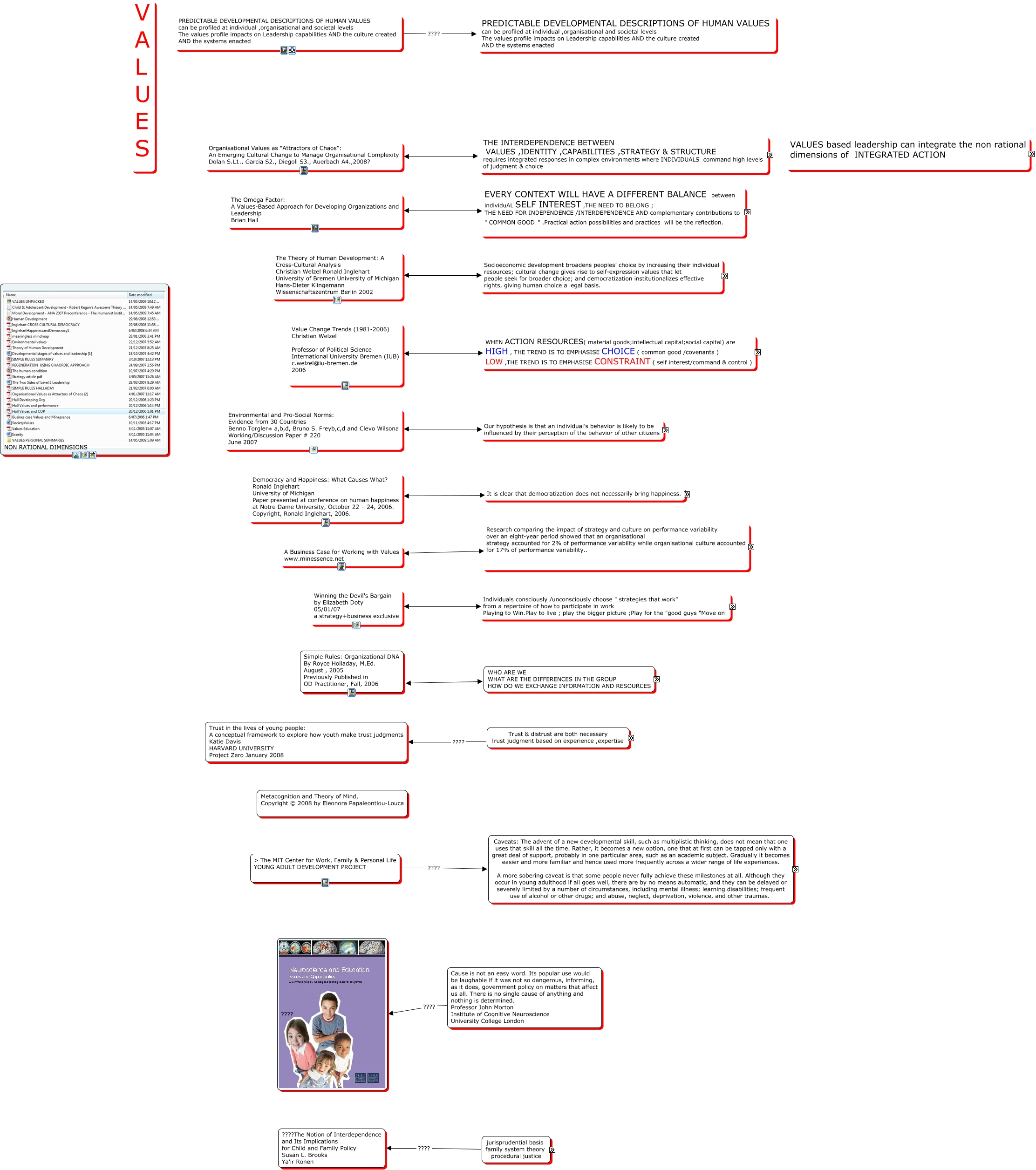This Concept Map, created with IHMC CmapTools, has information related to: VALUES key concepts, A Business Case for Working with Values www.minessence.net ???? ????, > The MIT Center for Work, Family & Personal Life YOUNG ADULT DEVELOPMENT PROJECT ???? Caveats: The advent of a new developmental skill, such as multiplistic thinking, does not mean that one uses that skill all the time. Rather, it becomes a new option, one that at first can be tapped only with a great deal of support, probably in one particular area, such as an academic subject. Gradually it becomes easier and more familiar and hence used more frequently across a wider range of life experiences. A more sobering caveat is that some people never fully achieve these milestones at all. Although they occur in young adulthood if all goes well, there are by no means automatic, and they can be delayed or severely limited by a number of circumstances, including mental illness; learning disabilities; frequent use of alcohol or other drugs; and abuse, neglect, deprivation, violence, and other traumas., CONSTRAINT Emphasize RELIGIOSITY Emphasize PATRIOTISM Respect AUTHORITY Teach OBEDIENCE Emphasize traditional FAMLISM, Emphasize civil and political FREEDOM Support and practice public EXPRESSION Tolerate NONCONFORMITY Feel SELF-DIRECTION Sense HUMAN TRUST People tend to value the choices they are capable to practice. Emphasize RELIGIOSITY Emphasize PATRIOTISM Respect AUTHORITY Teach OBEDIENCE Emphasize traditional FAMLISM, Cause is not an easy word. Its popular use would be laughable if it was not so dangerous, informing, as it does, government policy on matters that affect us all. There is no single cause of anything and nothing is determined. Professor John Morton Institute of Cognitive Neuroscience University College London ???? ????, Winning the Devil's Bargain by Elizabeth Doty 05/01/07 a strategy+business exclusive ???? Playing to Win. Skeptical about grandiose aspirations or altruistic ideas, especially in the workplace, they put their faith in drive, intelligence, and free markets to propel them to the top. Theytook on challenges just to see if they could, putting work at the center of their lives and deferring their personal dreams and ideals until they had sufficient power and wealth to command respect., jurisprudential basis family system theory procedural justice ???? ????The Notion of Interdependence and Its Implications for Child and Family Policy Susan L. Brooks Ya’ir Ronen, Democracy and Happiness: What Causes What? Ronald Inglehart University of Michigan Paper presented at conference on human happiness at Notre Dame University, October 22 – 24, 2006. Copyright, Ronald Inglehart, 2006. But it is clear that democratization does not necessarily bring happiness. 4 CORRELATION SATISFACTION & DEMOCRACY 1970/2005, The Theory of Human Development: A Cross-Cultural Analysis Christian Welzel Ronald Inglehart University of Bremen University of Michigan Hans-Dieter Klingemann Wissenschaftszentrum Berlin 2002 ???? Socioeconomic development broadens peoples’ choice by increasing their individual resources; cultural change gives rise to self-expression values that let people seek for broader choice; and democratization institutionalizes effective rights, giving human choice a legal basis., The Omega Factor: A Values-Based Approach for Developing Organizations and Leadership Brian Hall ???? ????, Trust & distrust are both necessary Trust judgment based on experience ,expertise ???? Trust in the lives of young people: A conceptual framework to explore how youth make trust judgments Katie Davis HARVARD UNIVERSITY Project Zero January 2008, Emphasize civil and political FREEDOM Support and practice public EXPRESSION Tolerate NONCONFORMITY Feel SELF-DIRECTION Sense HUMAN TRUST People tend to value the choices they are capable to practice. Value Change Trends (1981-2006) Christian Welzel Professor of Political Science International University Bremen (IUB) c.welzel@iu-bremen.de 2006, Environmental and Pro-Social Norms: Evidence from 30 Countries Benno Torgler∗ a,b,d, Bruno S. Freyb,c,d and Clevo Wilsona Working/Discussion Paper # 220 June 2007 ???? empirical and experimental findings indicate that deterrence models predict too little compliance. People are more compliant than these models predict. The level of compliance observed cannot be explained by the amount of risk aversion involved. The literature suggests that social norms help us to explain the high degree of compliance (Torgler, 2007)., PREDICTABLE DEVELOPMENTAL DESCRIPTIONS OF HUMAN VALUES can be profiled at individual ,organisational and societal levels The values profile impacts on Leadership capabilities AND the culture created AND the systems enacted ???? PREDICTABLE DEVELOPMENTAL DESCRIPTIONS OF HUMAN VALUES can be profiled at individual ,organisational and societal levels The values profile impacts on Leadership capabilities AND the culture created AND the systems enacted, Emphasize civil and political FREEDOM Support and practice public EXPRESSION Tolerate NONCONFORMITY Feel SELF-DIRECTION Sense HUMAN TRUST CHOICE