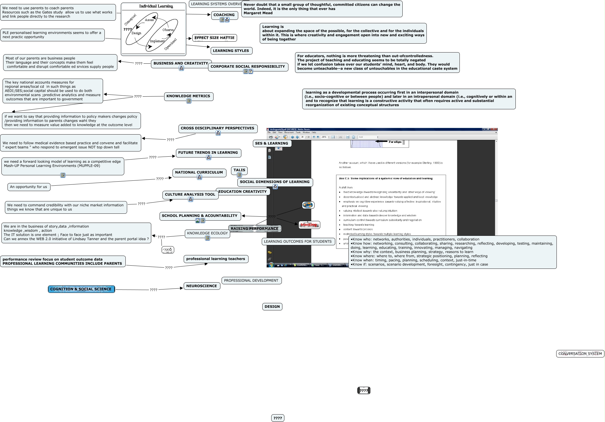 This Concept Map, created with IHMC CmapTools, has information related to: LEARNING SYSTEMS OVERVIEW, KNOWLEDGE ECOLOGY ???? ????, BUSINESS AND CREATIVITY ???? Most of our parents are business people Their language and their concepts make them feel comfortable and disrupt comfortable ed srvices supply people, We need to use parents to coach parents Resources such as the Gates study allow us to use what works and link people directly to the research ???? COACHING, PLE personalised learning environments seems to offer a next practic opportunity ???? LEARNING STYLES, We need to command credibility with our niche market information things we know that are unique to us ???? CULTURE ANALYSIS TOOL, ???? ???? tracking, KNOWLEDGE METRICS ???? if we want to say that providing information to policy makers changes policy /providing information to parents changes waht they then we need to measure value added to knowledge at the outcome level, CROSS DISCIPLINARY PERSPECTIVES ???? We need to follow medical evidence based practice and convene and facilitate " expert teams " who respond to emergent issue NOT top down tell, KNOWLEDGE METRICS ???? The key national accounts measures for regional areas/local cd in such things as AEDI;SES;social capital should be used to do both environmental scans ;predictive analytics and measure outcomes that are important to government, we need a forward looking model of learning as a competitive edge Mash-UP Personal Learning Environments (MUPPLE-09) ???? FUTURE TRENDS IN LEARNING, KNOWLEDGE ECOLOGY ???? We are in the business of story,data ,information knowledge ,wisdom , action The IT solution is one element ; Face to face just as important Can we annex the WEB 2.0 initiative of Lindsay Tanner and the parent portal idea ?, An opportunity for us ???? NATIONAL CURRICULUM, ???? ???? SCHOOL PLANNING & ACOUNTABILITY, ???? ???? RAISING PERFORMANCE, PLE personalised learning environments seems to offer a next practic opportunity ???? EFFECT SIZE HATTIE, performance review focus on student outcome data PROFESSIONAL LEARNING COMMUNITIES INCLUDE PARENTS ???? professional learning teachers, COGNITION & SOCIAL SCIENCE ???? NEUROSCIENCE