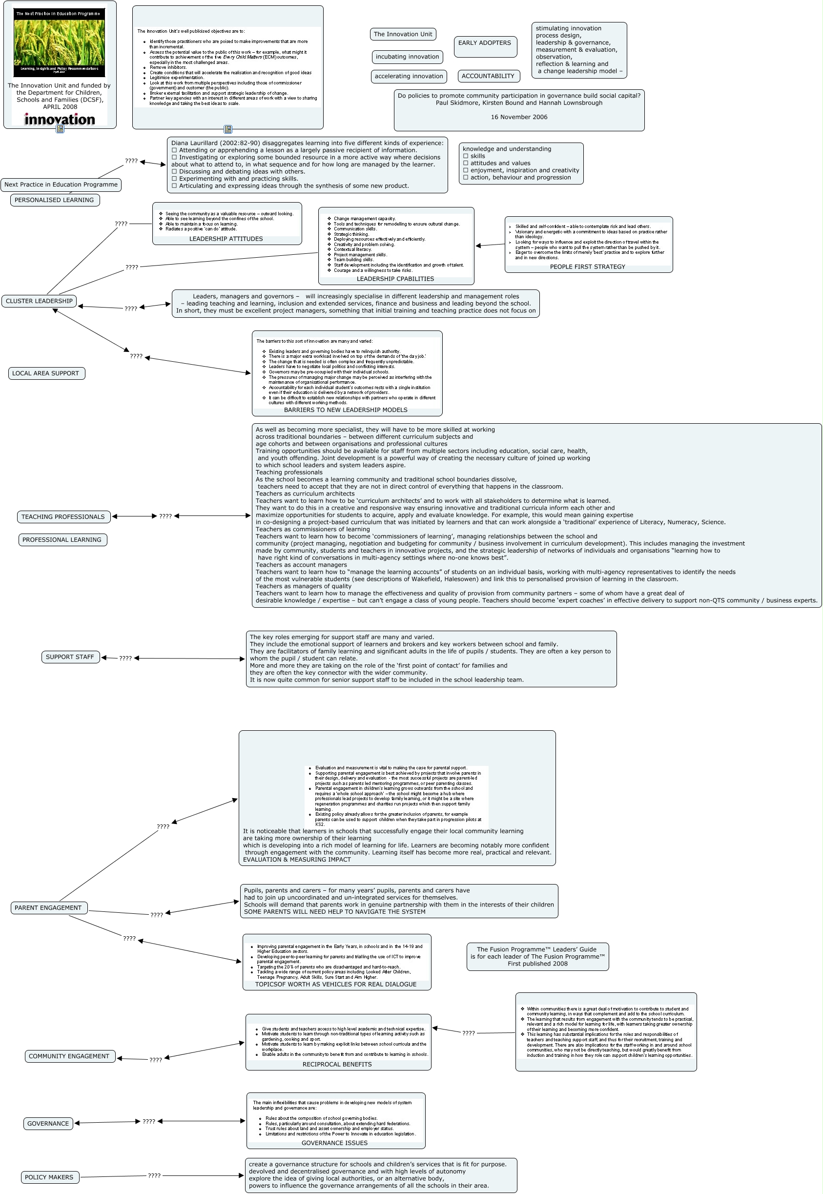 This Concept Map, created with IHMC CmapTools, has information related to: NEXT PRACTICE UK INNOVATION UNIT, RECIPROCAL BENEFITS ???? COMMUNITY ENGAGEMENT, The key roles emerging for support staff are many and varied. They include the emotional support of learners and brokers and key workers between school and family. They are facilitators of family learning and significant adults in the life of pupils / students. They are often a key person to whom the pupil / student can relate. More and more they are taking on the role of the ‘first point of contact’ for families and they are often the key connector with the wider community. It is now quite common for senior support staff to be included in the school leadership team. ???? SUPPORT STAFF, PARENT ENGAGEMENT ???? TOPICSOF WORTH AS VEHICLES FOR REAL DIALOGUE, GOVERNANCE ISSUES ???? GOVERNANCE, It is noticeable that learners in schools that successfully engage their local community learning are taking more ownership of their learning which is developing into a rich model of learning for life. Learners are becoming notably more confident through engagement with the community. Learning itself has become more real, practical and relevant. EVALUATION & MEASURING IMPACT ???? PARENT ENGAGEMENT, PARENT ENGAGEMENT ???? Pupils, parents and carers – for many years’ pupils, parents and carers have had to join up uncoordinated and un-integrated services for themselves. Schools will demand that parents work in genuine partnership with them in the interests of their children SOME PARENTS WILL NEED HELP TO NAVIGATE THE SYSTEM, ???? RECIPROCAL BENEFITS, Leaders, managers and governors – will increasingly specialise in different leadership and management roles – leading teaching and learning, inclusion and extended services, finance and business and leading beyond the school. In short, they must be excellent project managers, something that initial training and teaching practice does not focus on ???? CLUSTER LEADERSHIP, PEOPLE FIRST STRATEGY ???? LEADERSHIP CPABILITIES, BARRIERS TO NEW LEADERSHIP MODELS ???? CLUSTER LEADERSHIP, Diana Laurillard (2002:82-90) disaggregates learning into five different kinds of experience: Attending or apprehending a lesson as a largely passive recipient of information. Investigating or exploring some bounded resource in a more active way where decisions about what to attend to, in what sequence and for how long are managed by the learner. Discussing and debating ideas with others. Experimenting with and practicing skills. Articulating and expressing ideas through the synthesis of some new product. ???? PERSONALISED LEARNING, As well as becoming more specialist, they will have to be more skilled at working across traditional boundaries – between different curriculum subjects and age cohorts and between organisations and professional cultures Training opportunities should be available for staff from multiple sectors including education, social care, health, and youth offending. Joint development is a powerful way of creating the necessary culture of joined up working to which school leaders and system leaders aspire. Teaching professionals As the school becomes a learning community and traditional school boundaries dissolve, teachers need to accept that they are not in direct control of everything that happens in the classroom. Teachers as curriculum architects Teachers want to learn how to be ‘curriculum architects’ and to work with all stakeholders to determine what is learned. They want to do this in a creative and responsive way ensuring innovative and traditional curricula inform each other and maximize opportunities for students to acquire, apply and evaluate knowledge. For example, this would mean gaining expertise in co-designing a project-based curriculum that was initiated by learners and that can work alongside a ‘traditional’ experience of Literacy, Numeracy, Science. Teachers as commissioners of learning Teachers want to learn how to become ‘commissioners of learning’, managing relationships between the school and community (project managing, negotiation and budgeting for community / business involvement in curriculum development). This includes managing the investment made by community, students and teachers in innovative projects, and the strategic leadership of networks of individuals and organisations “learning how to have right kind of conversations in multi-agency settings where no-one knows best”. Teachers as account managers Teachers want to learn how to “manage the learning accounts” of students on an individual basis, working with multi-agency representatives to identify the needs of the most vulnerable students (see descriptions of Wakefield, Halesowen) and link this to personalised provision of learning in the classroom. Teachers as managers of quality Teachers want to learn how to manage the effectiveness and quality of provision from community partners – some of whom have a great deal of desirable knowledge / expertise – but can’t engage a class of young people. Teachers should become ‘expert coaches’ in effective delivery to support non-QTS community / business experts. ???? TEACHING PROFESSIONALS, LEADERSHIP ATTITUDES ???? CLUSTER LEADERSHIP, LEADERSHIP CPABILITIES ???? CLUSTER LEADERSHIP, POLICY MAKERS ???? create a governance structure for schools and children’s services that is fit for purpose. devolved and decentralised governance and with high levels of autonomy explore the idea of giving local authorities, or an alternative body, powers to influence the governance arrangements of all the schools in their area.
