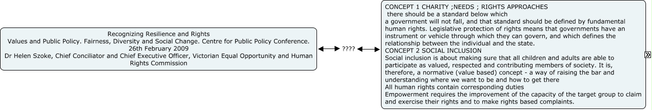 This Concept Map, created with IHMC CmapTools, has information related to: HUMAN RIGHTS AUSTRALIA SZOKE, CONCEPT 1 CHARITY ;NEEDS ; RIGHTS APPROACHES there should be a standard below which a government will not fall, and that standard should be defined by fundamental human rights. Legislative protection of rights means that governments have an instrument or vehicle through which they can govern, and which defines the relationship between the individual and the state. CONCEPT 2 SOCIAL INCLUSION Social inclusion is about making sure that all children and adults are able to participate as valued, respected and contributing members of society. It is, therefore, a normative (value based) concept - a way of raising the bar and understanding where we want to be and how to get there All human rights contain corresponding duties Empowerment requires the improvement of the capacity of the target group to claim and exercise their rights and to make rights based complaints. ???? Recognizing Resilience and Rights Values and Public Policy. Fairness, Diversity and Social Change. Centre for Public Policy Conference. 26th February 2009 Dr Helen Szoke, Chief Conciliator and Chief Executive Officer, Victorian Equal Opportunity and Human Rights Commission