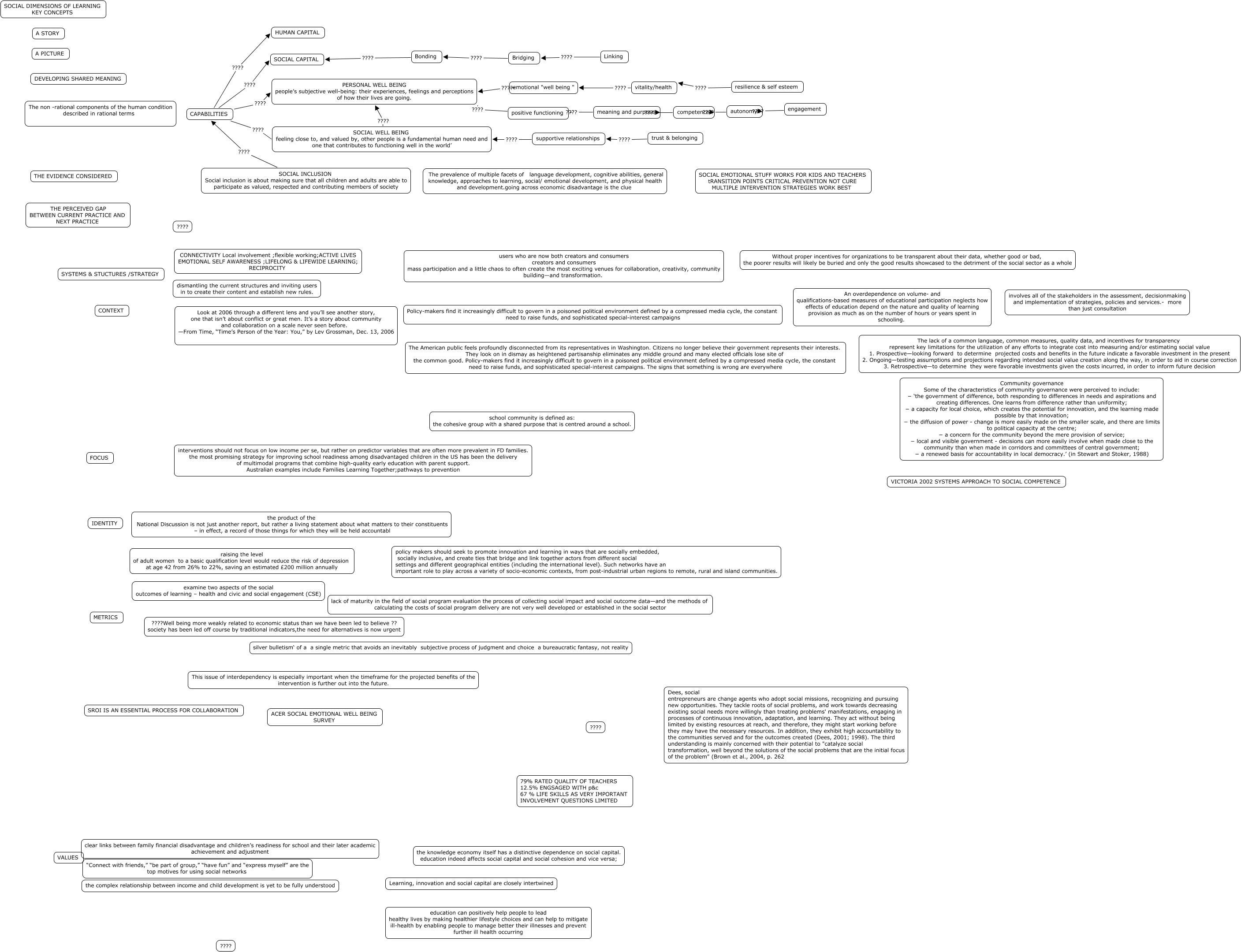 This Concept Map, created with IHMC CmapTools, has information related to: SOCIAL DIMENSIONS of learning personal summary june 1, meaning and purpose ???? positive functioning, SOCIAL INCLUSION Social inclusion is about making sure that all children and adults are able to participate as valued, respected and contributing members of society ???? CAPABILITIES, Linking ???? Bridging, competence ???? meaning and purpose, CAPABILITIES ???? HUMAN CAPITAL, Bridging ???? Bonding, engagement ???? autonomy, resilience & self esteem ???? vitality/health, positive functioning ???? PERSONAL WELL BEING people’s subjective well-being: their experiences, feelings and perceptions of how their lives are going., vitality/health ???? emotional "well being ", emotional "well being " ???? PERSONAL WELL BEING people’s subjective well-being: their experiences, feelings and perceptions of how their lives are going., CAPABILITIES ???? SOCIAL CAPITAL, trust & belonging ???? supportive relationships, Bonding ???? SOCIAL CAPITAL, SOCIAL WELL BEING feeling close to, and valued by, other people is a fundamental human need and one that contributes to functioning well in the world’ ???? PERSONAL WELL BEING people’s subjective well-being: their experiences, feelings and perceptions of how their lives are going., CAPABILITIES ???? PERSONAL WELL BEING people’s subjective well-being: their experiences, feelings and perceptions of how their lives are going., autonomy ???? competence, supportive relationships ???? SOCIAL WELL BEING feeling close to, and valued by, other people is a fundamental human need and one that contributes to functioning well in the world’, CAPABILITIES ???? SOCIAL WELL BEING feeling close to, and valued by, other people is a fundamental human need and one that contributes to functioning well in the world’