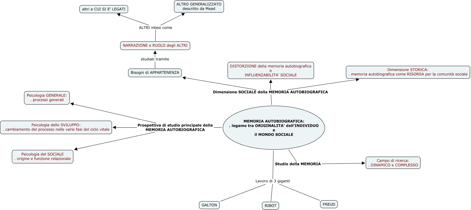Questa Cmap, creata con IHMC CmapTools, contiene informazioni relative a: MEMORIA AUTOBIOGRAFICA - Coscienza di sè e appartenenze sociali, MEMORIA AUTOBIOGRAFICA: . legame tra ORIGINALITA' dell'INDIVIDUO e il MONDO SOCIALE Dimensione SOCIALE della MEMORIA AUTOBIOGRAFICA DISTORZIONE della memoria autobiografica e INFLUENZABILITA' SOCIALE, MEMORIA AUTOBIOGRAFICA: . legame tra ORIGINALITA' dell'INDIVIDUO e il MONDO SOCIALE Lavoro di 3 giganti GALTON, NARRAZIONE e RUOLO degli ALTRI ALTRI intesi come altri a CUI SI E' LEGATI, MEMORIA AUTOBIOGRAFICA: . legame tra ORIGINALITA' dell'INDIVIDUO e il MONDO SOCIALE Lavoro di 3 giganti FREUD, MEMORIA AUTOBIOGRAFICA: . legame tra ORIGINALITA' dell'INDIVIDUO e il MONDO SOCIALE Studio della MEMORIA Campo di ricerca: . DINAMICO e COMPLESSO, MEMORIA AUTOBIOGRAFICA: . legame tra ORIGINALITA' dell'INDIVIDUO e il MONDO SOCIALE Prospettiva di studio principale della MEMORIA AUTOBIOGRAFICA Psicologia del SOCIALE . origine e funzione relazionale, Bisogni di APPARTENENZA studiati tramite NARRAZIONE e RUOLO degli ALTRI, NARRAZIONE e RUOLO degli ALTRI ALTRI intesi come ALTRO GENERALIZZATO descritto da Mead, MEMORIA AUTOBIOGRAFICA: . legame tra ORIGINALITA' dell'INDIVIDUO e il MONDO SOCIALE Lavoro di 3 giganti RIBOT, MEMORIA AUTOBIOGRAFICA: . legame tra ORIGINALITA' dell'INDIVIDUO e il MONDO SOCIALE Prospettiva di studio principale della MEMORIA AUTOBIOGRAFICA Psicologia dello SVILUPPO: . cambiamento del processo nelle varie fasi del ciclo vitale, MEMORIA AUTOBIOGRAFICA: . legame tra ORIGINALITA' dell'INDIVIDUO e il MONDO SOCIALE Prospettiva di studio principale della MEMORIA AUTOBIOGRAFICA Psicologia GENERALE: . processi generali, MEMORIA AUTOBIOGRAFICA: . legame tra ORIGINALITA' dell'INDIVIDUO e il MONDO SOCIALE Dimensione SOCIALE della MEMORIA AUTOBIOGRAFICA Bisogni di APPARTENENZA, MEMORIA AUTOBIOGRAFICA: . legame tra ORIGINALITA' dell'INDIVIDUO e il MONDO SOCIALE Dimensione SOCIALE della MEMORIA AUTOBIOGRAFICA Dimensione STORICA: . memoria autobiografica come RISORSA per la comunità sociale