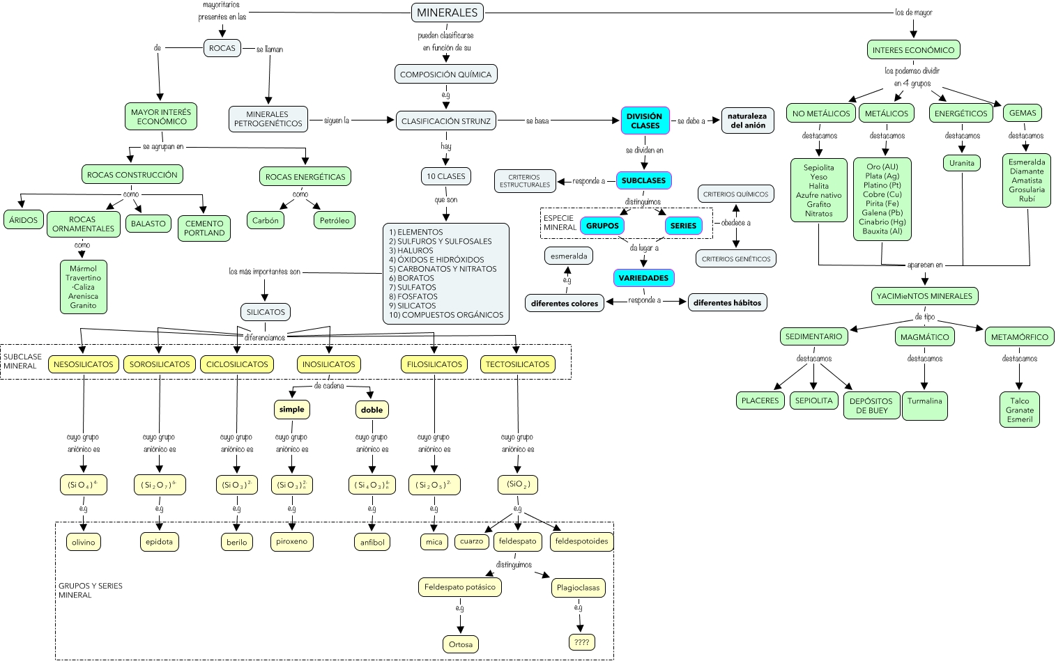 Este Cmap, tiene información relacionada con: Tema 07, MINERALES los de mayor INTERES ECONÓMICO, INOSILICATOS de cadena doble, ROCAS CONSTRUCCIÓN como CEMENTO PORTLAND, SUBCLASES distinguimos SERIES, simple cuyo grupo aniónico es <math xmlns="http://www.w3.org/1998/Math/MathML"> <mrow> <mtext> (Si </mtext> <mmultiscripts> <mtext> O </mtext> <mtext> 3 </mtext> <none/> </mmultiscripts> <mmultiscripts> <mtext> ) </mtext> <mtext> n </mtext> <mtext> 2- </mtext> </mmultiscripts> </mrow> </math>, ROCAS CONSTRUCCIÓN como ÁRIDOS, TECTOSILICATOS cuyo grupo aniónico es <math xmlns="http://www.w3.org/1998/Math/MathML"> <mrow> <mtext> </mtext> <mmultiscripts> <mtext> (SiO </mtext> <mtext> 2 </mtext> <none/> </mmultiscripts> <mtext> ) </mtext> </mrow> </math>, <math xmlns="http://www.w3.org/1998/Math/MathML"> <mrow> <mtext> </mtext> <mmultiscripts> <mtext> (SiO </mtext> <mtext> 2 </mtext> <none/> </mmultiscripts> <mtext> ) </mtext> </mrow> </math> e.g cuarzo, MAYOR INTERÉS ECONÓMICO se agrupan en ROCAS CONSTRUCCIÓN, NESOSILICATOS cuyo grupo aniónico es <math xmlns="http://www.w3.org/1998/Math/MathML"> <mrow> <mtext> (Si </mtext> <mmultiscripts> <mtext> O </mtext> <mtext> 4 </mtext> <none/> </mmultiscripts> <mmultiscripts> <mtext> ) </mtext> <none/> <mtext> 4- </mtext> </mmultiscripts> <mtext> </mtext> </mrow> </math>, feldespato distinguimos Feldespato potásico, Plagioclasas e.g ????, 1) ELEMENTOS 2) SULFUROS Y SULFOSALES 3) HALUROS 4) ÓXIDOS E HIDRÓXIDOS 5) CARBONATOS Y NITRATOS 6) BORATOS 7) SULFATOS 8) FOSFATOS 9) SILICATOS 10) COMPUESTOS ORGÁNICOS los más importantes son SILICATOS, SEDIMENTARIO destacamos SEPIOLITA, METÁLICOS destacamos Oro (AU) Plata (Ag) Platino (Pt) Cobre (Cu) Pirita (Fe) Galena (Pb) Cinabrio (Hg) Bauxita (Al), SILICATOS diferenciamos TECTOSILICATOS, <math xmlns="http://www.w3.org/1998/Math/MathML"> <mrow> <mtext> </mtext> <mmultiscripts> <mtext> (SiO </mtext> <mtext> 2 </mtext> <none/> </mmultiscripts> <mtext> ) </mtext> </mrow> </math> e.g feldespotoides, SILICATOS diferenciamos CICLOSILICATOS, SUBCLASES responde a CRITERIOS ESTRUCTURALES, INTERES ECONÓMICO los podemso dividir en 4 grupos ENERGÉTICOS