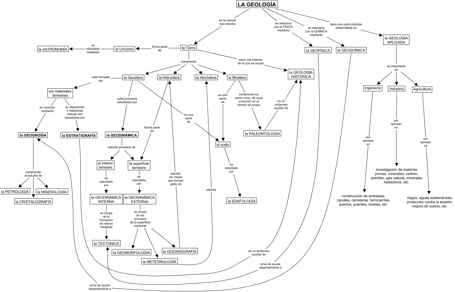 Este Cmap, tiene información relacionada con: Introducción geología, el interior terrestre es estudiado por la GEODINÁMICA INTERNA, los materiales terrestres su disposición y relaciones mútuas son estudiadas por la ESTRATIGRAFÍA, la GEOGNOSIA comprende el estudio de la MINERALOGÍA, Agricultura por ejemplo en riegos, aguas subterráneas, protección contra la erosión, mejora de suelos, etc., la Geosfera es una parte de el suelo, la Tierra tiene una historia de la que se ocupa la GEOLOGÍA HISTÓRICA, Ingeniería por ejemplo en construcción de embalses, canales, carreteras, ferrocarriles, puertos, puentes, túneles, etc., la GEOLOGÍA APLICADA es importante en Industria, LA GEOLOGÍA es la ciencia que estudia la Tierra, LA GEOLOGÍA tiene una parte práctica desarrollada en la GEOLOGÍA APLICADA, la GEODINÁMICA INTERNA se ocupa de la formación de relieve mediante la TECTÓNICA, el Universo es estudiado mediante la ASTRONOMÍA, la GEOGNOSIA comprende el estudio de la PETROLOGÍA, la Tierra comprende la Biosfera, Industria por ejemplo en investigación de materias primas, minerales, carbón, petróleo, gas natural, minerales radiactivos, etc., la superficie terrestre es estudiada por la GEODINÁMICA EXTERNA, la Hidrosfera forma parte de la superficie terrestre, la ESTRATIGRAFÍA es un poderoso auxiliar de la GEOLOGÍA HISTÓRICA, la GEODINÁMICA EXTERNA se ocupa de los procesos de la superficie mediante la GEOMORFOLOGÍA, la GEOGNOSIA comprende el estudio de la CRISTALOGRAFÍA