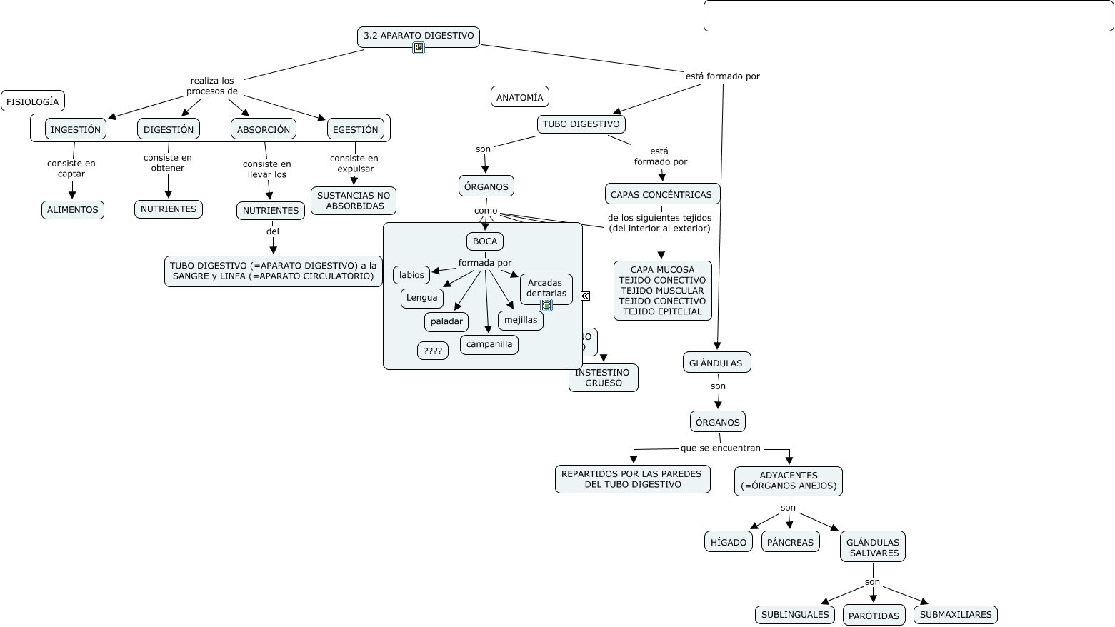 Este Cmap, tiene información relacionada con: 3.2 El aparato digestivo, BOCA formada por Arcadas dentarias, BOCA formada por Lengua, NUTRIENTES del TUBO DIGESTIVO (=APARATO DIGESTIVO) a la SANGRE y LINFA (=APARATO CIRCULATORIO), EGESTIÓN consiste en expulsar SUSTANCIAS NO ABSORBIDAS, ÓRGANOS como FARINGE, ADYACENTES (=ÓRGANOS ANEJOS) son GLÁNDULAS SALIVARES, 3.2 APARATO DIGESTIVO realiza los procesos de INGESTIÓN, ÓRGANOS que se encuentran REPARTIDOS POR LAS PAREDES DEL TUBO DIGESTIVO, 3.2 APARATO DIGESTIVO realiza los procesos de EGESTIÓN, CAPAS CONCÉNTRICAS de los siguientes tejidos (del interior al exterior) CAPA MUCOSA TEJIDO CONECTIVO TEJIDO MUSCULAR TEJIDO CONECTIVO TEJIDO EPITELIAL, ÓRGANOS como INSTESTINO GRUESO, BOCA formada por labios, BOCA formada por campanilla, ÓRGANOS que se encuentran ADYACENTES (=ÓRGANOS ANEJOS), TUBO DIGESTIVO está formado por CAPAS CONCÉNTRICAS, 3.2 APARATO DIGESTIVO está formado por GLÁNDULAS, GLÁNDULAS son ÓRGANOS, DIGESTIÓN consiste en obtener NUTRIENTES, 3.2 APARATO DIGESTIVO está formado por TUBO DIGESTIVO, BOCA formada por paladar
