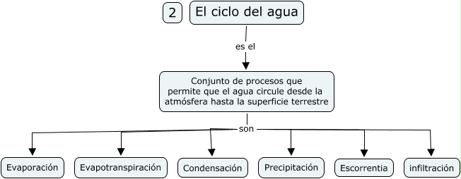 Este Cmap, tiene información relacionada con: Tema 6.2 Ciclo del agua, El ciclo del agua es el Conjunto de procesos que permite que el agua circule desde la atmósfera hasta la superficie terrestre, Conjunto de procesos que permite que el agua circule desde la atmósfera hasta la superficie terrestre son infiltración, Conjunto de procesos que permite que el agua circule desde la atmósfera hasta la superficie terrestre son Evapotranspiración, Conjunto de procesos que permite que el agua circule desde la atmósfera hasta la superficie terrestre son Condensación, Conjunto de procesos que permite que el agua circule desde la atmósfera hasta la superficie terrestre son Precipitación, Conjunto de procesos que permite que el agua circule desde la atmósfera hasta la superficie terrestre son Evaporación, Conjunto de procesos que permite que el agua circule desde la atmósfera hasta la superficie terrestre son Escorrentia