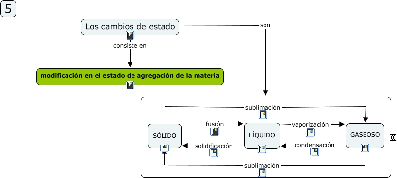Este Cmap, tiene información relacionada con: Tema 3.5, Los cambios de estado son ????, SÓLIDO fusión LÍQUIDO, Los cambios de estado consiste en modificación en el estado de agregación de la materia, SÓLIDO sublimación GASEOSO, GASEOSO sublimación SÓLIDO, LÍQUIDO vaporización GASEOSO, LÍQUIDO solidificación SÓLIDO, GASEOSO condensación LÍQUIDO