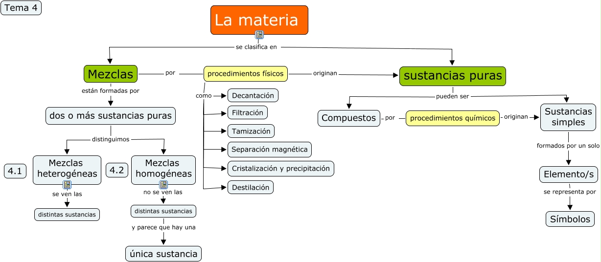 Este Cmap, tiene información relacionada con: Tema 4.1, Mezclas homogéneas no se ven las distintas sustancias, procedimientos físicos como Cristalización y precipitación, La materia se clasifica en sustancias puras, dos o más sustancias puras distinguimos Mezclas homogéneas, procedimientos físicos como Decantación, sustancias puras pueden ser Sustancias simples, procedimientos físicos como Separación magnética, distintas sustancias y parece que hay una única sustancia, Mezclas por procedimientos físicos, procedimientos físicos como Tamización, La materia se clasifica en Mezclas, Elemento/s se representa por Símbolos, Mezclas heterogéneas se ven las distintas sustancias, dos o más sustancias puras distinguimos Mezclas heterogéneas, procedimientos físicos como Destilación, Compuestos por procedimientos químicos, Mezclas están formadas por dos o más sustancias puras, Sustancias simples formados por un solo Elemento/s, procedimientos químicos originan Sustancias simples, procedimientos físicos originan sustancias puras