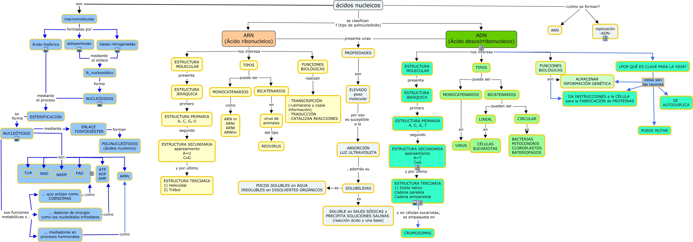 Este Cmap, tiene información relacionada con: 4.1 Ácidos nucleicos, ENLACE FOSFODIÉSTER forman POLINUCLEÓTIDOS (ácidos nucleicos), ARN (Ácido ribonucleico) nos interesa FUNCIONES BIOLÓGICAS, TIPOS puede ser BICATENARIOS, ESTRUCTURA PRIMARIA A, C, G, U segundo ESTRUCTURA SECUNDARIA apareamiento A=U C≡G, NUCLEÓTIDOS sus funciones metabólicas s .. ... mediadores en procesos hormonales, FUNCIONES BIOLÓGICAS son · DA INSTRUCCIONES a la CÉLULA para la FABRICACIÓN de PROTEÍNAS, TIPOS puede ser BICATENARIOS, NUCLEÓTIDOS son NAD, virus de animales del tipo REOVIRUS, ¿POR QUÉ ES CLAVE PARA LA VIDA? estas son las razones · DA INSTRUCCIONES a la CÉLULA para la FABRICACIÓN de PROTEÍNAS, TIPOS puede ser MONOCATENARIOS, aldopentosas mediante el enlace N_nucleosídico, BICATENARIOS en virus de animales, ARN (Ácido ribonucleico) presenta unas PROPIEDADES, ... que actúan como COENZIMAS como ????, ESTRUCTURA SECUNDARIA apareamiento A=T C≡G y por último ESTRUCTURA TERCIARIA 1) Doble hélice Cadena paralela Cadena antiparalela, ADN (Ácido desoxirribonucleico) nos interesa TIPOS, ¿POR QUÉ ES CLAVE PARA LA VIDA? estas son las razones ALMACENAR INFORMACIÓN GENÉTICA, NUCLEÓTIDOS son FAD, FUNCIONES BIOLÓGICAS realizan · TRANSCRIPCIÓN (=almacena y copia información) · TRADUCCIÓN · CATALIZAN REACCIONES