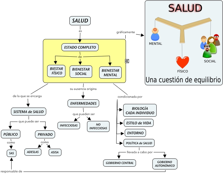 Este Cmap, tiene información relacionada con: 1 Qué es la salud, gráficamente, ESTADO COMPLETO de BIENESTAR MENTAL, condicionada por ENTORNO, SISTEMA de SALUD que puede ser PÚBLICO, su ausencia origina ENFERMEDADES, ESTADO COMPLETO de BIESTAR FÍSICO, PRIVADO como ASISA, SISTEMA de SALUD que puede ser PRIVADO, POLÍTICA de SALUD llevada a cabo por GOBIERNO CENTRAL, ENFERMEDADES que pueden ser NO INFECCIOSAS, PRIVADO como ADESLAS, PÚBLICO como SAS, de la que se encarga SISTEMA de SALUD, SALUD es ESTADO COMPLETO, ENFERMEDADES que pueden ser INFECCIOSAS, condicionada por POLÍTICA de SALUD, POLÍTICA de SALUD llevada a cabo por GOBIERNO AUTONÓMICO, condicionada por ESTILO de VIDA, ESTADO COMPLETO de BIENESTAR SOCIAL, condicionada por BIOLOGÍA CADA INDIVIDUO