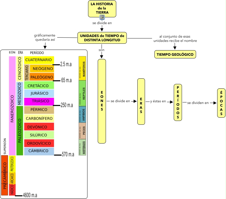 Este Cmap, tiene información relacionada con: 6 Tiempo geológico, E O N E S se divide en E R A S, E R A S y éstas en P E R Í O D O S, UNIDADES de TIEMPO de DISTINTA LONGITUD al conjunto de esas unidades recibe el nombre TIEMPO GEOLÓGICO, P E R Í O D O S se dividen en É P O C A S, LA HISTORIA de la TIERRA se divide en UNIDADES de TIEMPO de DISTINTA LONGITUD, UNIDADES de TIEMPO de DISTINTA LONGITUD gráficamente quedaría así, UNIDADES de TIEMPO de DISTINTA LONGITUD son E O N E S