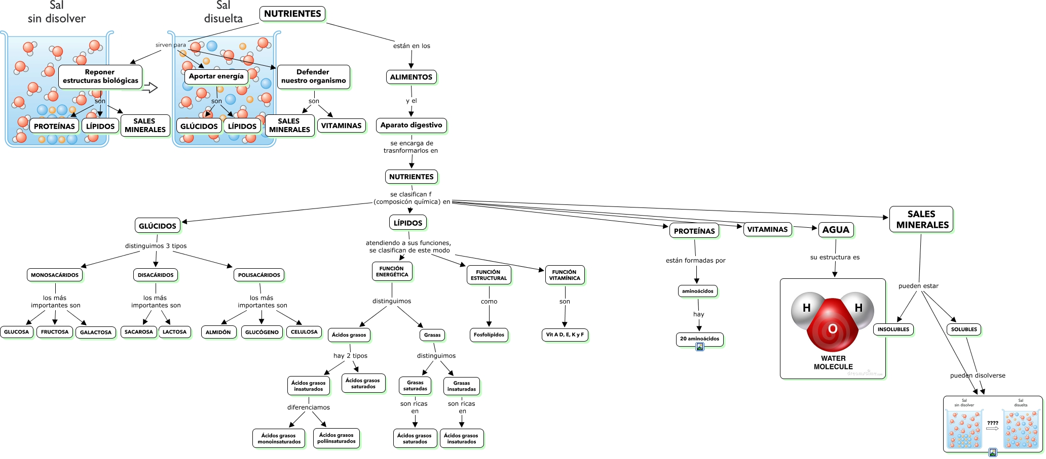 Este Cmap, tiene información relacionada con: Los nutrientes, Defender nuestro organismo son SALES MINERALES, NUTRIENTES se clasifican f (composicón química) en LÍPIDOS, FUNCIÓN VITAMÍNICA son Vit A D, E, K y F, GLÚCIDOS distinguimos 3 tipos MONOSACÁRIDOS, FUNCIÓN ENERGÉTICA distinguimos Grasas, DISACÁRIDOS los más importantes son SACAROSA, Ácidos grasos hay 2 tipos Ácidos grasos saturados, Ácidos grasos insaturados diferenciamos Ácidos grasos poliinsaturados, Grasas distinguimos Grasas insaturadas, NUTRIENTES se clasifican f (composicón química) en VITAMINAS, LÍPIDOS atendiendo a sus funciones, se clasifican de este modo FUNCIÓN ESTRUCTURAL, NUTRIENTES se clasifican f (composicón química) en GLÚCIDOS, NUTRIENTES sirven para Aportar energía, DISACÁRIDOS los más importantes son LACTOSA, POLISACÁRIDOS los más importantes son GLUCÓGENO, FUNCIÓN ENERGÉTICA distinguimos Ácidos grasos, Grasas saturadas son ricas en Ácidos grasos saturados, MONOSACÁRIDOS los más importantes son GALACTOSA, Aportar energía son LÍPIDOS, PROTEÍNAS están formadas por aminoácidos