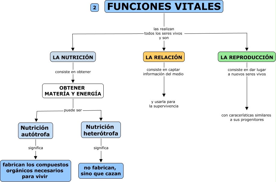 Este Cmap, tiene información relacionada con: 8.2 Funciones vitales, OBTENER MATERÍA Y ENERGÍA puede ser Nutrición heterótrofa, Nutrición heterótrofa significa no fabrican, sino que cazan, FUNCIONES VITALES las realizan todos los seres vivos y son LA RELACIÓN, LA REPRODUCCIÓN consiste en dar lugar a nuevos seres vivos con caracerísticas similares a sus progenitores, OBTENER MATERÍA Y ENERGÍA puede ser Nutrición autótrofa, FUNCIONES VITALES las realizan todos los seres vivos y son LA NUTRICIÓN, FUNCIONES VITALES las realizan todos los seres vivos y son LA REPRODUCCIÓN, LA RELACIÓN consiste en captar información del medio y usarla para la supervivencia, LA NUTRICIÓN consiste en obtener OBTENER MATERÍA Y ENERGÍA, Nutrición autótrofa significa fabrican los compuestos orgánicos necesarios para vivir