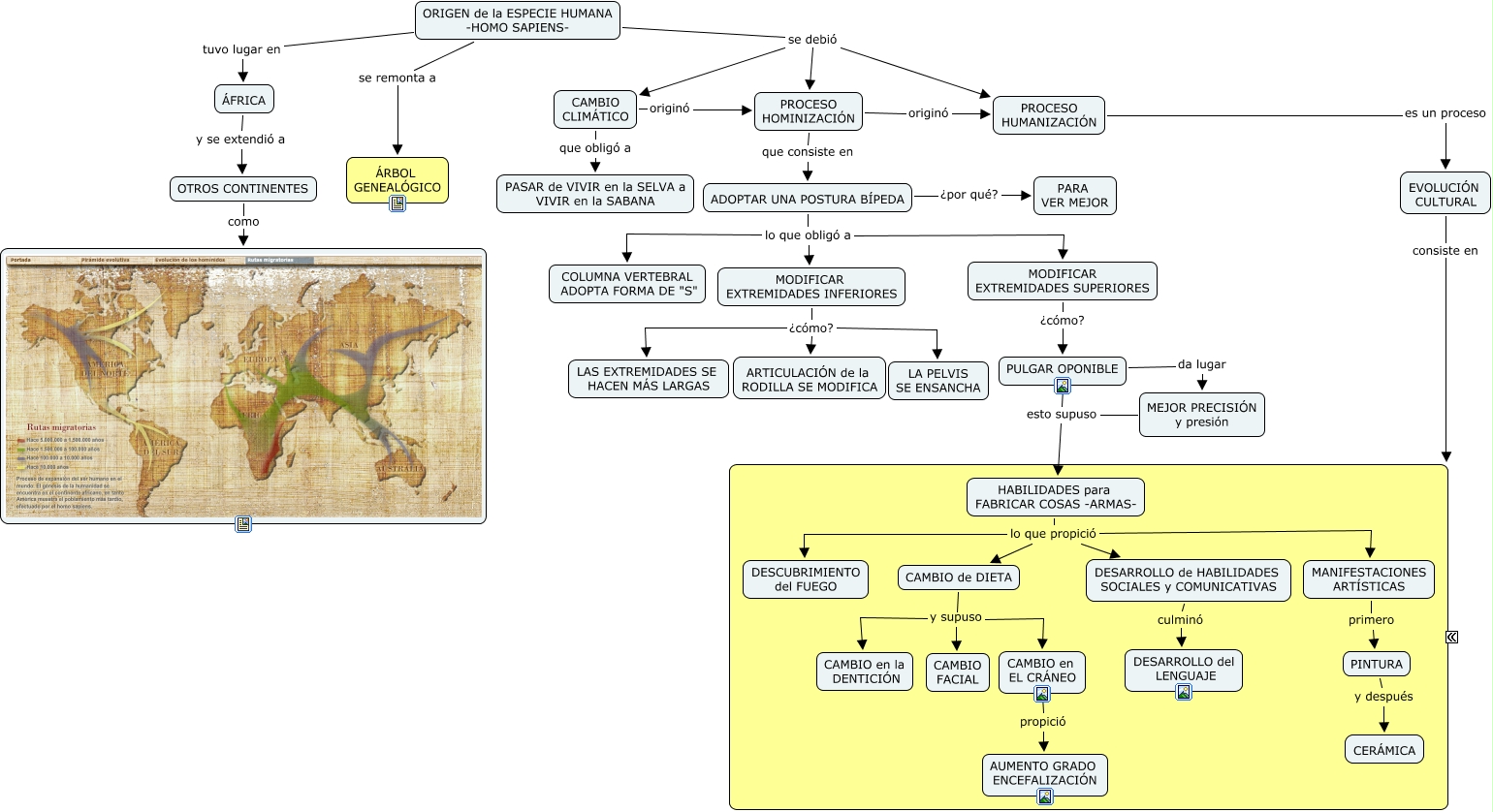 Este Cmap, tiene información relacionada con: 3.6 El origen de la especie humana, ORIGEN de la ESPECIE HUMANA -HOMO SAPIENS- se debió PROCESO HUMANIZACIÓN, MEJOR PRECISIÓN y presión esto supuso HABILIDADES para FABRICAR COSAS -ARMAS-, MANIFESTACIONES ARTÍSTICAS primero PINTURA, CAMBIO CLIMÁTICO que obligó a PASAR de VIVIR en la SELVA a VIVIR en la SABANA, CAMBIO CLIMÁTICO originó PROCESO HOMINIZACIÓN, MODIFICAR EXTREMIDADES INFERIORES ¿cómo? ARTICULACIÓN de la RODILLA SE MODIFICA, CAMBIO de DIETA y supuso CAMBIO en EL CRÁNEO, CAMBIO en EL CRÁNEO propició AUMENTO GRADO ENCEFALIZACIÓN, ADOPTAR UNA POSTURA BÍPEDA ¿por qué? PARA VER MEJOR, MODIFICAR EXTREMIDADES INFERIORES ¿cómo? LA PELVIS SE ENSANCHA, ADOPTAR UNA POSTURA BÍPEDA lo que obligó a MODIFICAR EXTREMIDADES SUPERIORES, HABILIDADES para FABRICAR COSAS -ARMAS- lo que propició CAMBIO de DIETA, HABILIDADES para FABRICAR COSAS -ARMAS- lo que propició DESCUBRIMIENTO del FUEGO, HABILIDADES para FABRICAR COSAS -ARMAS- lo que propició DESARROLLO de HABILIDADES SOCIALES y COMUNICATIVAS, PULGAR OPONIBLE da lugar MEJOR PRECISIÓN y presión, ÁFRICA y se extendió a OTROS CONTINENTES, OTROS CONTINENTES como, MODIFICAR EXTREMIDADES INFERIORES ¿cómo? LAS EXTREMIDADES SE HACEN MÁS LARGAS, ORIGEN de la ESPECIE HUMANA -HOMO SAPIENS- se remonta a ÁRBOL GENEALÓGICO, ADOPTAR UNA POSTURA BÍPEDA lo que obligó a MODIFICAR EXTREMIDADES INFERIORES