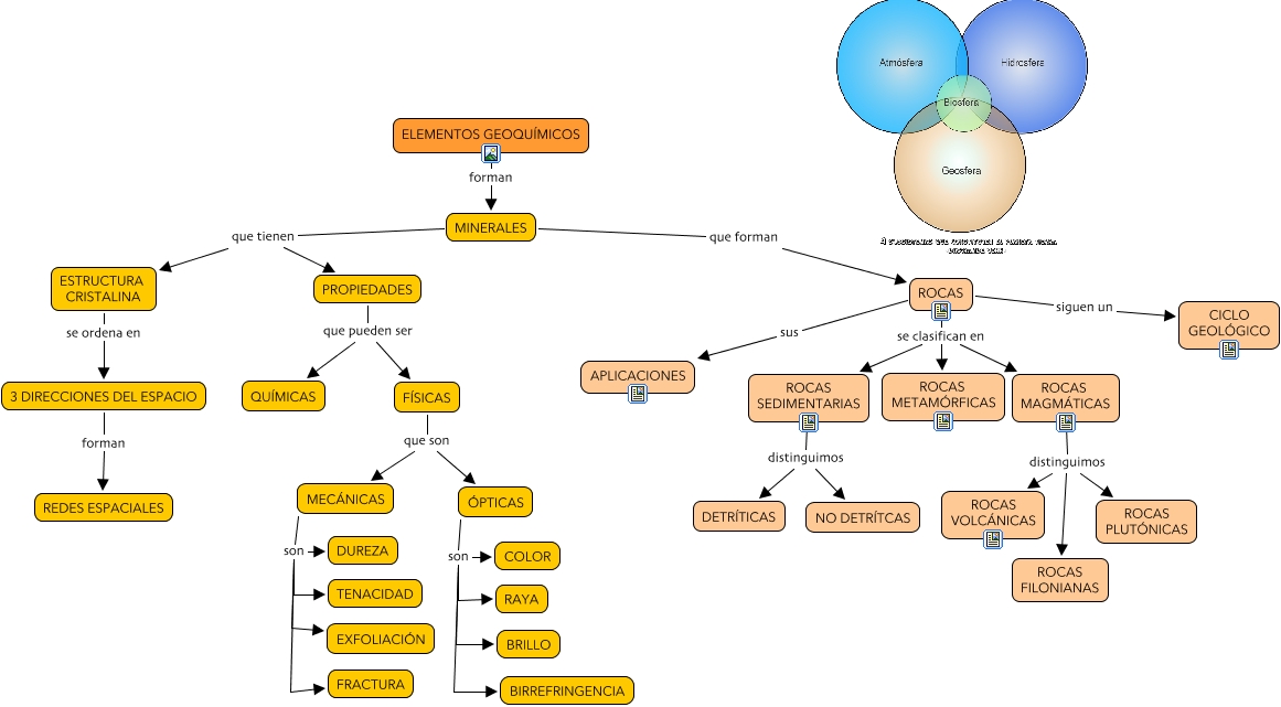 Este Cmap, tiene información relacionada con: Rocas de la geosfera, MINERALES que tienen PROPIEDADES, MECÁNICAS son EXFOLIACIÓN, MECÁNICAS son TENACIDAD, PROPIEDADES que pueden ser QUÍMICAS, ROCAS sus APLICACIONES, ROCAS MAGMÁTICAS distinguimos ROCAS FILONIANAS, PROPIEDADES que pueden ser FÍSICAS, ÓPTICAS son RAYA, ÓPTICAS son BIRREFRINGENCIA, ROCAS SEDIMENTARIAS distinguimos NO DETRÍTCAS, MECÁNICAS son DUREZA, ROCAS MAGMÁTICAS distinguimos ROCAS PLUTÓNICAS, ELEMENTOS GEOQUÍMICOS forman MINERALES, ROCAS MAGMÁTICAS distinguimos ROCAS VOLCÁNICAS, ÓPTICAS son BRILLO, 3 DIRECCIONES DEL ESPACIO forman REDES ESPACIALES, ROCAS siguen un CICLO GEOLÓGICO, ESTRUCTURA CRISTALINA se ordena en 3 DIRECCIONES DEL ESPACIO, ROCAS se clasifican en ROCAS METAMÓRFICAS, ROCAS se clasifican en ROCAS MAGMÁTICAS