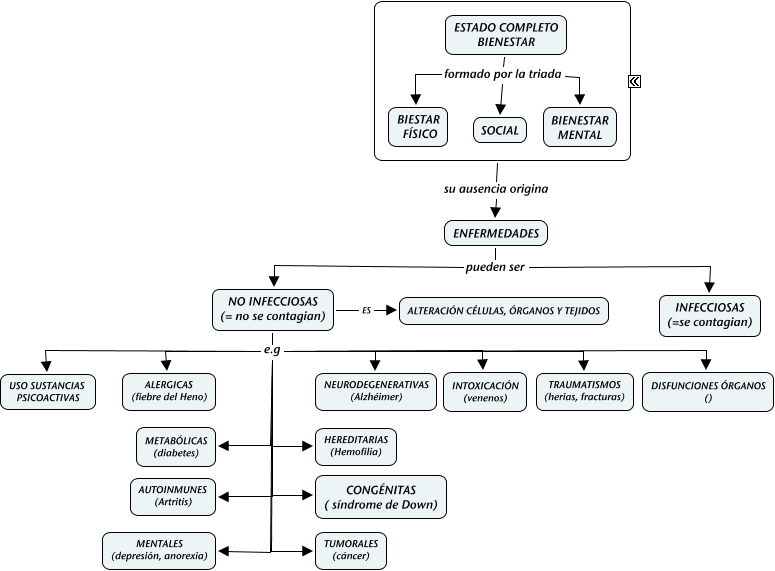 Este Cmap, tiene información relacionada con: 3 Enfermedades no infecciosas, NO INFECCIOSAS (= no se contagian) e.g TRAUMATISMOS (herias, fracturas), NO INFECCIOSAS (= no se contagian) e.g MENTALES (depresión, anorexia), NO INFECCIOSAS (= no se contagian) e.g INTOXICACIÓN (venenos), NO INFECCIOSAS (= no se contagian) ES ALTERACIÓN CÉLULAS, ÓRGANOS Y TEJIDOS, ESTADO COMPLETO BIENESTAR formado por la triada BIESTAR FÍSICO, NO INFECCIOSAS (= no se contagian) e.g NEURODEGENERATIVAS (Alzhéimer), su ausencia origina ENFERMEDADES, NO INFECCIOSAS (= no se contagian) e.g AUTOINMUNES (Artritis), NO INFECCIOSAS (= no se contagian) e.g TUMORALES (cáncer), NO INFECCIOSAS (= no se contagian) e.g USO SUSTANCIAS PSICOACTIVAS, ESTADO COMPLETO BIENESTAR formado por la triada BIENESTAR MENTAL, NO INFECCIOSAS (= no se contagian) e.g METABÓLICAS (diabetes), NO INFECCIOSAS (= no se contagian) e.g DISFUNCIONES ÓRGANOS (), NO INFECCIOSAS (= no se contagian) e.g HEREDITARIAS (Hemofilia), ENFERMEDADES pueden ser INFECCIOSAS (=se contagian), NO INFECCIOSAS (= no se contagian) e.g CONGÉNITAS ( síndrome de Down), ESTADO COMPLETO BIENESTAR formado por la triada SOCIAL, NO INFECCIOSAS (= no se contagian) e.g ALERGICAS (fiebre del Heno), ENFERMEDADES pueden ser NO INFECCIOSAS (= no se contagian)