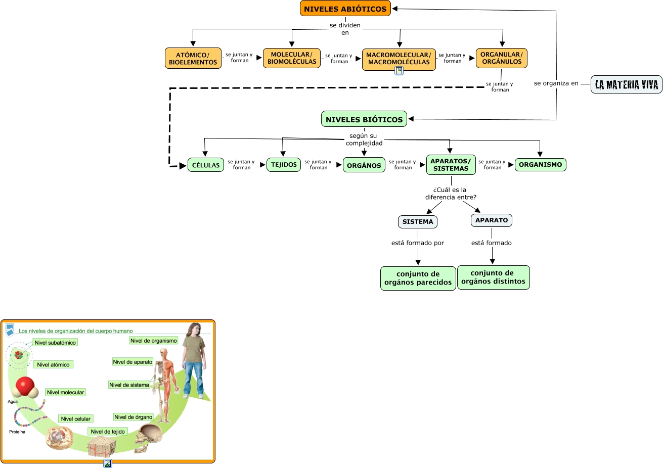 Este Cmap, tiene información relacionada con: 1. Los niveles de organización, NIVELES BIÓTICOS según su complejidad ORGANISMO, LA MATERIA VIVA se organiza en NIVELES ABIÓTICOS, CÉLULAS se juntan y forman TEJIDOS, NIVELES ABIÓTICOS se dividen en MACROMOLECULAR/ MACROMOLÉCULAS, NIVELES BIÓTICOS según su complejidad ORGÁNOS, ORGANULAR/ ORGÁNULOS se juntan y forman CÉLULAS, NIVELES ABIÓTICOS se dividen en ATÓMICO/ BIOELEMENTOS, SISTEMA está formado por conjunto de orgános parecidos, NIVELES BIÓTICOS según su complejidad CÉLULAS, APARATOS/ SISTEMAS se juntan y forman ORGANISMO, NIVELES ABIÓTICOS se dividen en MOLECULAR/ BIOMOLÉCULAS, TEJIDOS se juntan y forman ORGÁNOS, ORGÁNOS se juntan y forman APARATOS/ SISTEMAS, NIVELES BIÓTICOS según su complejidad TEJIDOS, APARATO está formado conjunto de orgános distintos, MACROMOLECULAR/ MACROMOLÉCULAS se juntan y forman ORGANULAR/ ORGÁNULOS, NIVELES ABIÓTICOS se dividen en ORGANULAR/ ORGÁNULOS, LA MATERIA VIVA se organiza en NIVELES BIÓTICOS, APARATOS/ SISTEMAS ¿Cuál es la diferencia entre? APARATO, APARATOS/ SISTEMAS ¿Cuál es la diferencia entre? SISTEMA